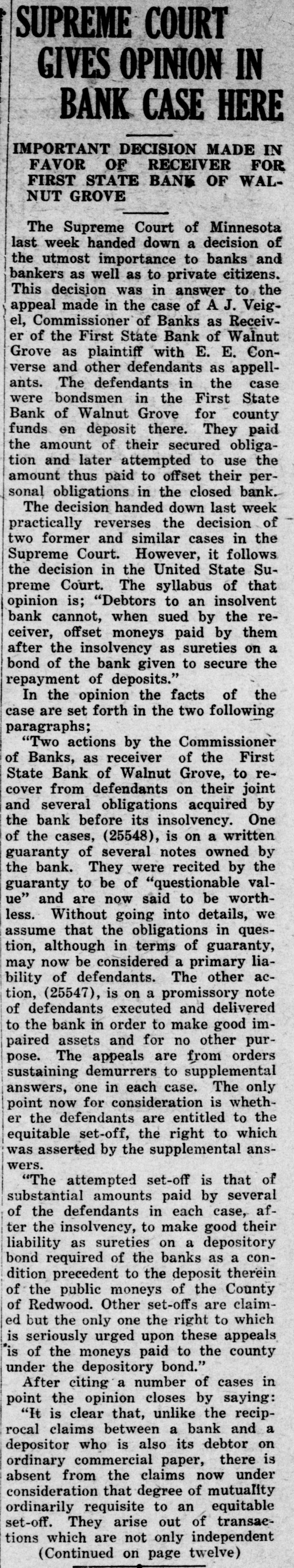 SUPREME COURT GIVES OPINION IN BANK CASE HERE IMPORTANT DECISION MADE IN FAVOR OF RECEIVER FOR FIRST STATE BANK OF WALNUT GROVE The Supreme Court of Minnesota last week handed down a decision of the utmost importance to banks and bankers as well as to private citizens. This decision was in answer to the appeal made in the case of A J. Veigel, Commissioner of Banks as Receiver of the First State Bank of Walnut Grove as plaintiff with E. E. Converse and other defendants as appellants. The defendants in the case were bondsmen in the First State Bank of Walnut Grove for county funds on deposit there. They paid the amount of their secured obligation and later attempted to use the amount thus paid to offset their personal obligations in the closed bank. The decision handed down last week practically reverses the decision of two former and similar cases in the Supreme Court. However, it follows the decision in the United State Supreme Court. The syllabus of that opinion is; "Debtors to an insolvent bank cannot, when sued by the receiver, offset moneys paid by them after the insolvency as sureties on a bond of the bank given to secure the repayment of deposits." In the opinion the facts of the case are set forth in the two following paragraphs; "Two actions by the Commissioner of Banks, as receiver of the First State Bank of Walnut Grove, to recover from defendants on their joint and several obligations acquired by the bank before its insolvency. One of the cases, (25548), is on a written guaranty of several notes owned by the bank. They were recited by the guaranty to be of "questionable value" and are now said to be worthless. Without going into details, we assume that the obligations in question, although in terms of guaranty, may now be considered a primary liability of defendants. The other action, (25547), is on a promissory note of defendants executed and delivered to the bank in order to make good impaired assets and for no other purpose. The appeals are from orders sustaining demurrers to supplemental answers, one in each case. The only point now for consideration is whether the defendants are entitled to the equitable set-off, the right to which was asserted by the supplemental answers. "The attempted set-off is that of substantial amounts paid by several of the defendants in each case, after the insolvency, to make good their liability as sureties on a depository bond required of the banks as a condition precedent to the deposit therein of the public moneys of the County of Redwood. Other set-offs are claimed but the only one the right to which is seriously urged upon these appeals is of the moneys paid to the county under the depository bond." After citing a number of cases in point the opinion closes by saying: "It is clear that, unlike the reciprocal claims between a bank and a depositor who is also its debtor on ordinary commercial paper, there is absent from the claims now under consideration that degree of mutuality ordinarily requisite to an equitable set-off. They arise out of transaetions which are not only independent (Continued on page twelve)