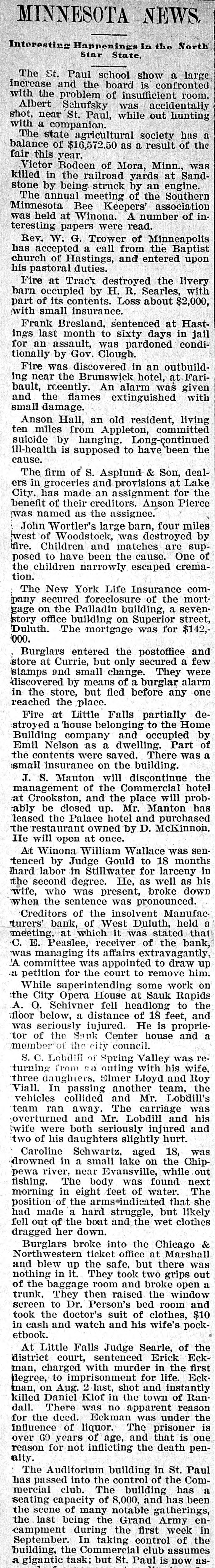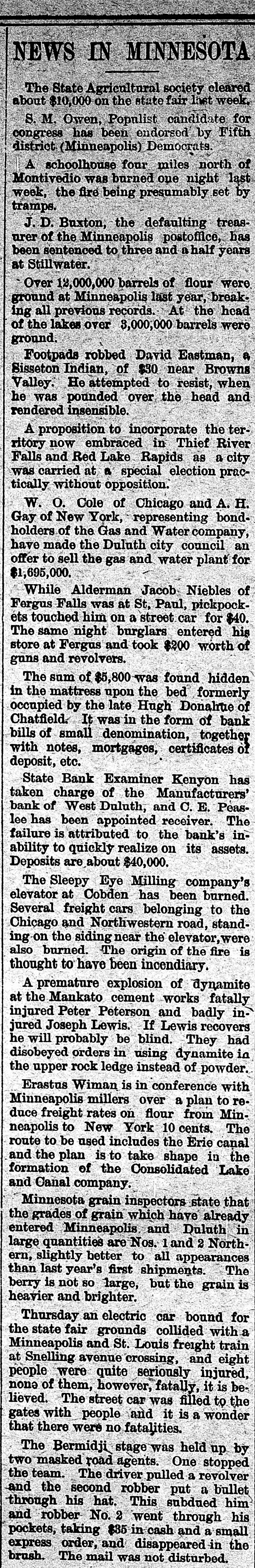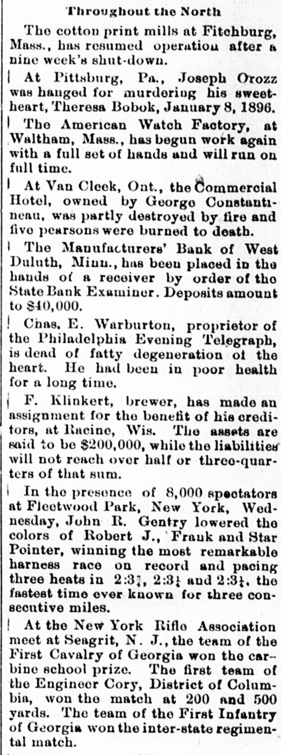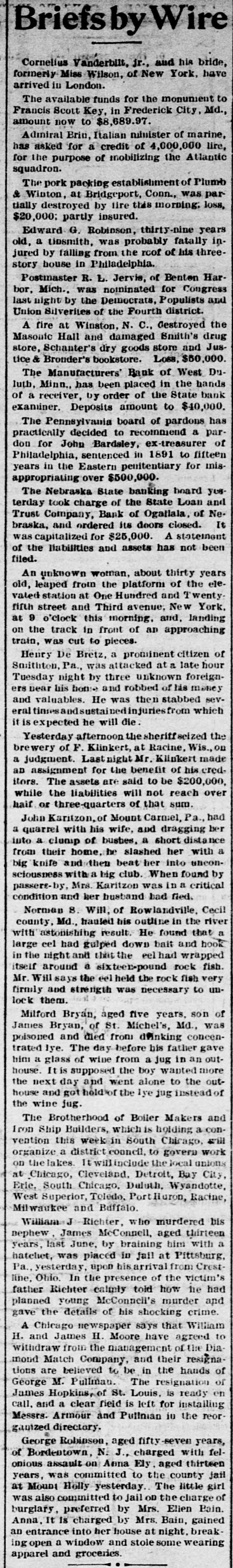 Briefs by Cornelius Vanderbilt, jr., and his bride, formerly Miss Wilson, of New York, have arrived in London. The available funds for the monument to Francis Scott Key, in Frederick City, Md., amount now to $8,689.97. Admiral Brin, Italian minister of marine, has asked for a credit of 4,000,000 lire, for the purpose of mobilizing the Atlantic squadron. The pork packing establishment of Plumb & Winton, at Bridgeport, Conn., was partially destroyed by fire this morning: loss, $20,000; partly insured. Edward G. Robinson, thirty-nine years old, a tinsmith, was probably fatally injured by falling from the roof of his threestory house in Philadelphia. Postmaster R. L. Jervis, of Benten Harbor, Mich., was nominated for Congress last night by the Democrats, Populists and Union Silverites of the Fourth district. A fire at Winston, N. C., destroyed the Masonic Hall and damaged Smith's drug store, Schanter's dry goods store and Justice & Bronder's bookstore. Loss, $50,000. The Manufacturers' Bank of West Duluth, Minn., has been placed in the hands of a receiver, by order of the State bank examiner. Deposits amount to $40,000. The Pennsylvania board of pardons has practically decided to recommend a pardon for John Bardsley, ex-treasurer of Philadelphia, sentenced in 1891 to fifteen years in the Eastern penitentiary for misappropriating over $500,000. The Nebraska State banking heard yesterday took charge of the State Loan and Trust Company, Bank of Ogallala, of Nebraska, and ordered its doors closed. It was capitalized for $25,000. A statement of the liabilities and assets has not been filed. An unknown woman, about thirty years old, leaped from the platform of the elevated station at One Hundred and Twenty. fifth street and Third avenue, New York. at 9 o'Clock this morning, and, landing on the track in front of an approaching train, was cut to pieces. Henry De Bretz, a prominent citizen of Smithton, Pa., was attacked at a late hour Tuesday night by three unknown foreigners near his home and robbed of his money and valuables. He was then stabbed several tinfesandsustainedinjuriesfrom which it is expected he will die. Yesterday afternoon the sheriffseized the brewery of F. Klinkert, at Racine, Wis., on a judgment. Lastnigh Mr. Klinkert made an assignment for the benefit of his creditors. The assets are said to be $200,000, while the liabilities will not reach over haif or three-quarters of that sum. John Karitzon, of Mount Carniel, Pa., had 199 Supplierp pare his THE burder E into a clump of bushes, a short distance from their home. he slashed her with a big knife and then beat her into unconsciousness with a big club. When found by passers-by, Mrs. Karitzon was in a critical condition and her husband bad fied. Normen S. Will, of Rowlandville, Cecil county, Md., hauled his outline in the river with astonishing result. He found that a large eel had gulped down bait and hook in the night and that the eel had wrapped itself around a sixteen-pound rock fish. Mr. Will says the eel held the rock fish very firmly and strength was necessary to unlock them. Milford Bryan, aged five years, son of James Bryan, of St. Michel's, Md., was