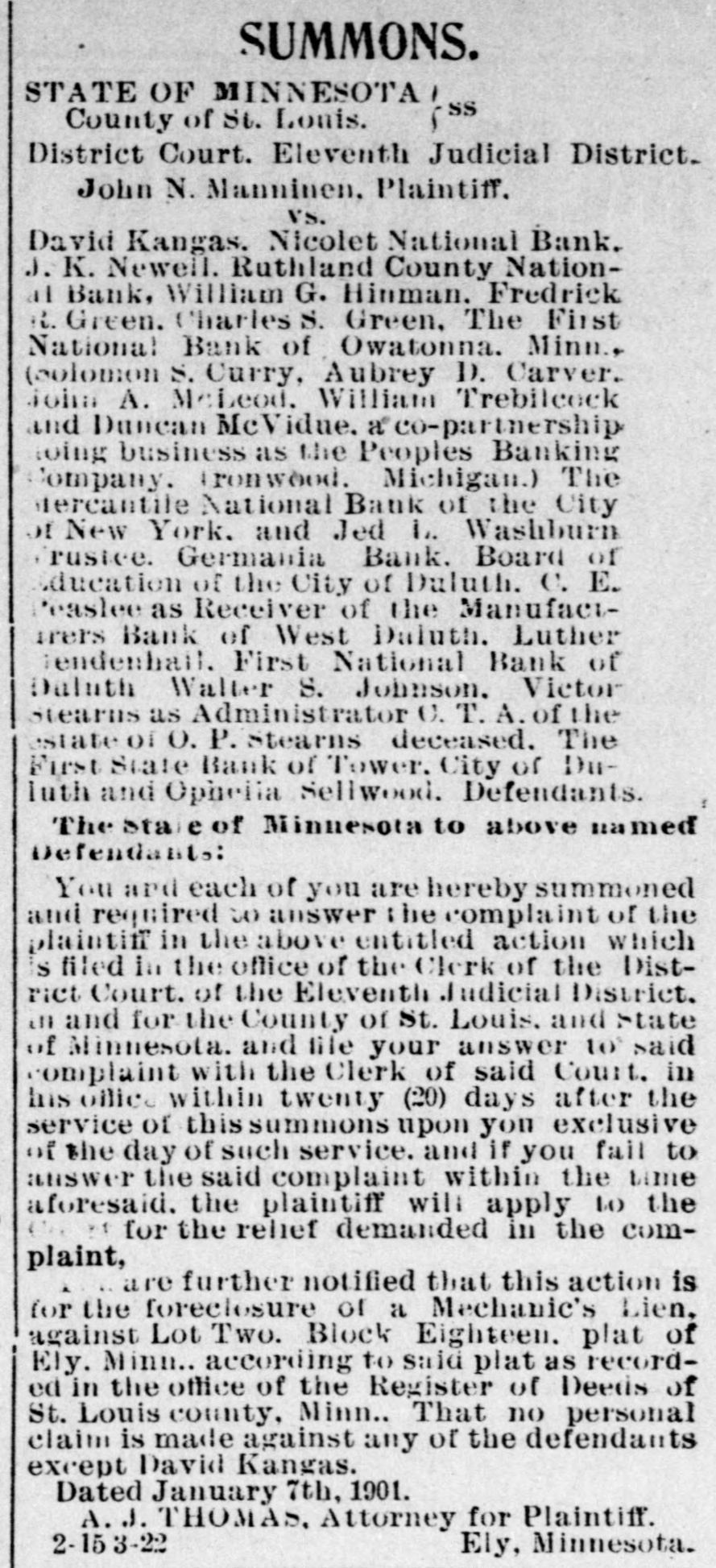 You and each of you are hereby summoned and required to answer the complaint of the plaintiffs in the above entitled action, which is filed in the office of the clerk of the district court of the Eleventh Judicial District in and for the County of St. Louis and State of Minnesota; and to serve a copy of your answer to the said complaint on the subscriber at his office in rooms 500-505 in the Lonsdale building in the City of Duluth in the County of St. Louis and State of Minnesota, within twenty days after service of this summons upon you, exclusive of the day of service, and if you fail to answer said complaint within the time aforesaid, the plaintiffs in this action will apply to the court for the relief demanded in the complaint.