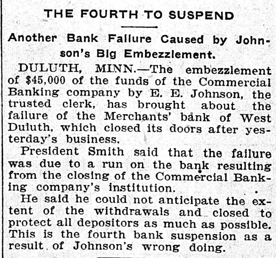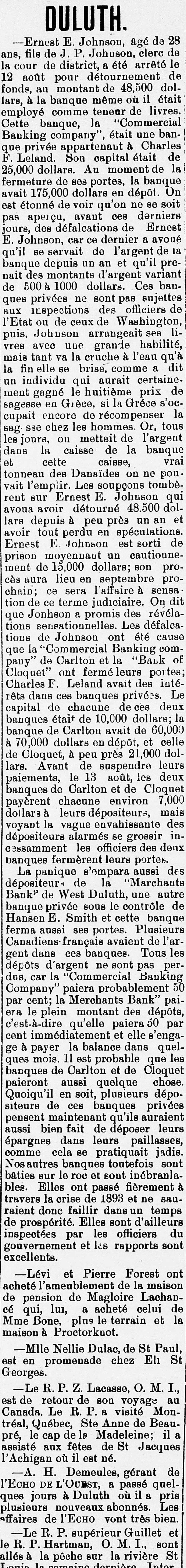 F. Leland. Son capital etait de 25,000 dollars. Au moment de la fermeture de ses portes, la banque avait 175,000 dollars en dépôt. On est étonné de voir qu'on ne se soit I pas aperçu, avant ces derniers jours, des défalcations de Ernest E. Johnson, car ce dernier a avoué qu'il se servait de l'argent de 18 banque depuis un an et qu'il prenait des montants d'argent variant de 500 à 1000 dollars. Ces banques privées ne sont pas sujettes aux inspections des officiers de l'Etat ou de ceux de Washington, puis, Johnson arrangeait ses livres avec une grande habilité, mais tant va la cruche à l'eau qu'à la fin elle se brise, comme a dit un individu qui aurait certainement gagné le huitième prix de sagesse en Grèce, si la Gréce s'occupait encore de récompenser la sag sse chez les hommes. Or, tous les jours, on mettait de l'argent dans la caisse de la banque et cette caisse, vrai tonneau des Danaïdes on ne pouvait l'emplir. Les soupçons tombèrent sur Ernest E. Johnson qui avoua avoir détourné 48.500 dollars depuis à peu près un an et avoir tout perdu en spéculations. Ernest E. Johnson est sorti de prison moyennaut un cautionnement de 15,000 dollars; son procès aura lieu en septembre prochain; ce sera l'affaire à sensation de ce terme judiciaire. On dit que Jonhson a promis des révélations sensationnelles. Les défalcations de Johnson ont été cause que la "Commercial Banking company" de Carlton et la "Bank of Cloquet" ont fermé leurs portes; Charles F. Leland avait des intérêts dans ces banques privées. Le capital de chacune de ces deux banques était de 10,000 dollare; la banque de Carlton avait de 60,000 à 70,000 dollars en dépôt, et celle de Cloquet, à peu près 21,000 dollars. Avant de suspendre leurs paiements, le 13 août, les deux banques de Carlton et de Cloquet payèrent chacune environ 7,000 dollars à leurs dépositeurs, mais voyant la vague envahissante des dépositeurs alarmés se grossir incessamment les officiers des denx banques fermèrent leurs portes. La panique s'empara aussi des dépositeur+ de la "Marchauts Bank" de West Duluth, une autre banque privée sous le contrôle de Hansen E. Smith et cette banque ferma aussi ses portes. Plusieurs Canadiens-français avaient de l'argent dans ces banques. Tous les dépôts d'argent ne sont pas perdus, car la "Commercial Banking Company" paiera probablement 50 par cent; la Merchants Bank" paiera le plein montant des dépôts, c'est-à-dire qu'elle paiera 50 par cent immédiatement et elle s'engage à payer la balance dans quelques mois. 11 est probable que les banques de Carlton et de Cloquet paieront aussi quelque chose. Quoiqu'il en soit, plusieurs dépositeurs de ces banques privées pensent maintenant qu'ils auraient aussi bien fait de déposer leurs épargnes dans leurs paillasses, comme cela se pratiquait jadis. Nosautres banques toutefois sont baties sur le roc et sont inébranlables. Elles ont passé fièrement à travers la crise de 1893 et ne sauraient donc faillir dans un temps de prospérité. Elles sont d'ailleurs inspectées par les officiers du gouvernement et les rapports sont excellents. -Lévi et Pierre Forest ont acheté l'ameublement de la maison de pension de Magloire Lachancé qui, lui, a acheté celui de Mme Bone, plus le terrain et la maison à Proctorknot. -Mlle Nellie Dulac, de St Paul, est en promenade chez Eli St Georges. -Le R. P. Z. Lacasse, O. M. I., est de retour de son voyage au Canada. Le R. P. a visité Montréal, Québec, Ste Anne de Beaupré, le cap de la Madeleine; il 8 assisté aux fêtes de St Jacques l'Achigan où il est né.