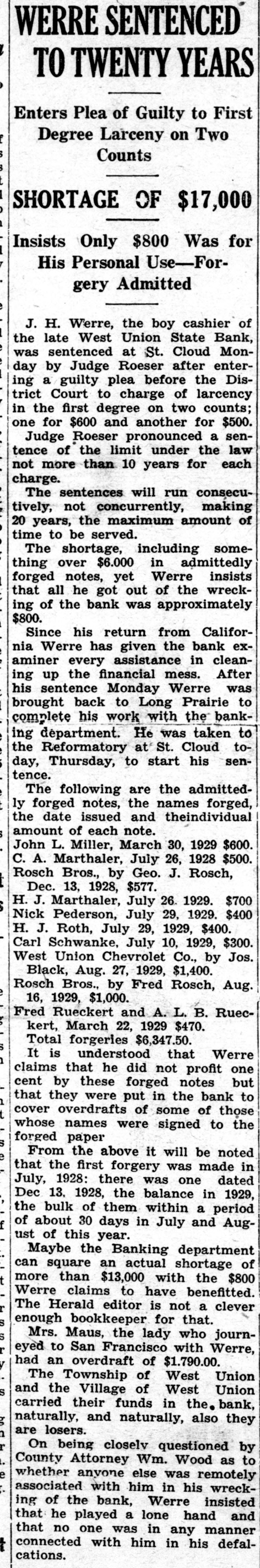 WERRE SENTENCED l TO TWENTY YEARS Enters Plea of Guilty to First f Degree Larceny on Two $ Counts I 1 SHORTAGE OF $17,000 , i y Insists Only $800 Was for i His Personal Use-Forgery Admitted e J. H. Werre, the boy cashier of 1 the late West Union State Bank, was sentenced at St. Cloud Mona ing day by guilty Judge plea Roeser before after the enter- Disto in first on trict the Court degree charge two of larcency counts; one for $600 and another for $500. Judge Roeser pronounced a sentence of the limit under the law not more than 10 years for each charge. The sentences will run consecutively, not concurrently, making 20 years, the maximum amount of time to be served. The shortage, including someover thing $6.000 in Werre admittedly insists forged notes, yet that he out all got of the wrecking of the bank was approximately $800. Since his return from California has examiner Werre every assistance given the in bank clean- After ing up the financial mess. his sentence Monday Werre was brought back to Long Prairie to his work complete with the taken bank- to ing department. He was the at Reformatory start St. Cloud his sen- today, Thursday, to tence. The following are the admittedly forged notes, the names forged, the date issued and theindividual amount of each note. March $600. C. 26, John A. L. Marthaler, Miller, July 30, 1928 1929 $500. Rosch Bros., by Geo. J. Rosch, Dec. 13, 1928, $577. H. 26. 1929. $700 $ Nick J. Marthaler, Pederson, July July 29, 1929. $400 H. J. Schwanke, Roth, July July 29, 10, 1929, 1929, $400. Carl $300. West Union Chevrolet Co., by Jos. Black, Aug. 27, 1929, $1,400. Rosch Bros., by Fred Rosch, Aug. e 16, 1929, $1,000. Fred Rueckert and A. L. B. Ruec$ kert, March 22, 1929 $470. Total forgeries $6,347.50. S It is understood that Werre 1 claims that he did not profit one cent by these forged notes that were to 1 they put in the of bank but cover overdrafts of some those t whose names were signed to the forged paper S From the above it will be noted e that the first forgery was made in was one 1929, July, Dec 13, 1928: 1928, there the balance in dated the bulk of them within a period of about 30 days in July and Augf ust of this year. can an of Maybe square the Banking actual shortage department t Werre more than claims $13,000 to have with benefitted. the $800 r The Herald editor is not a clever S enough bookkeeper for that. s Mrs. Maus, the lady who journeyed to San Francisco with Werre, had an overdraft of $1.790.00. y The Township of West Union S and the Village of West Union carried their funds in the. bank, g naturally, and naturally, also they are losers. n r On being closely questioned by i. County Attorney Wm. Wood as to was e whether anyone else remotely associated with him in his wreckthe that he a lone ing of played bank, Werre hand insisted and that no one was in any manner connected with him in his defalthe cations.