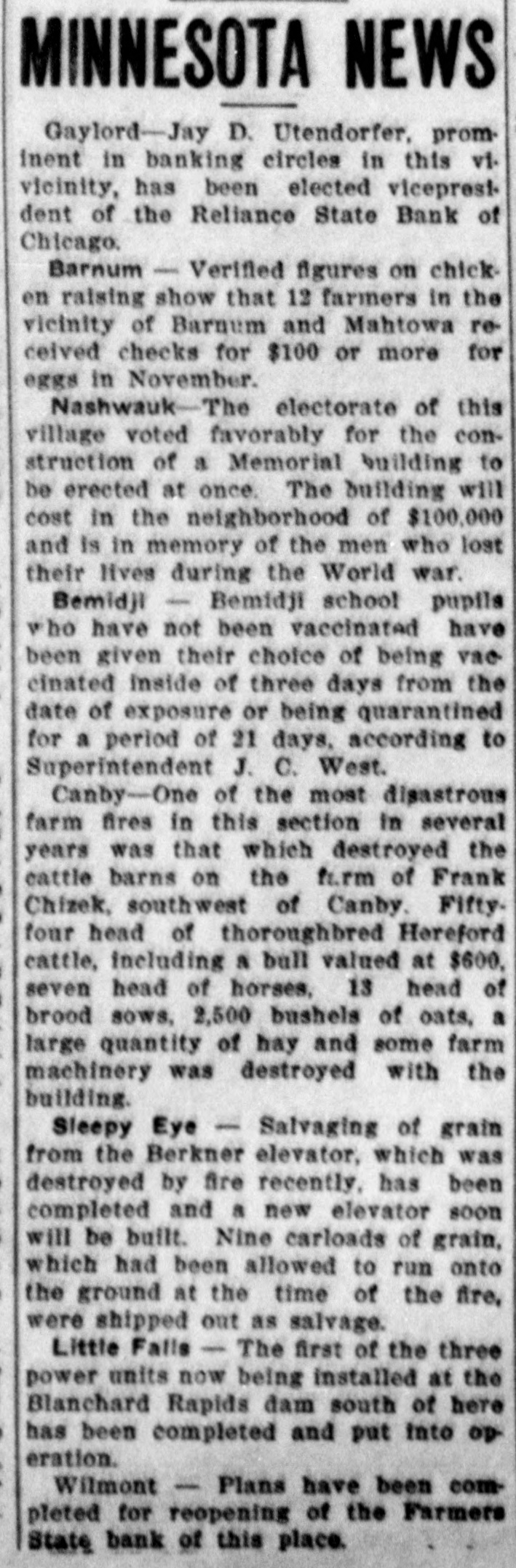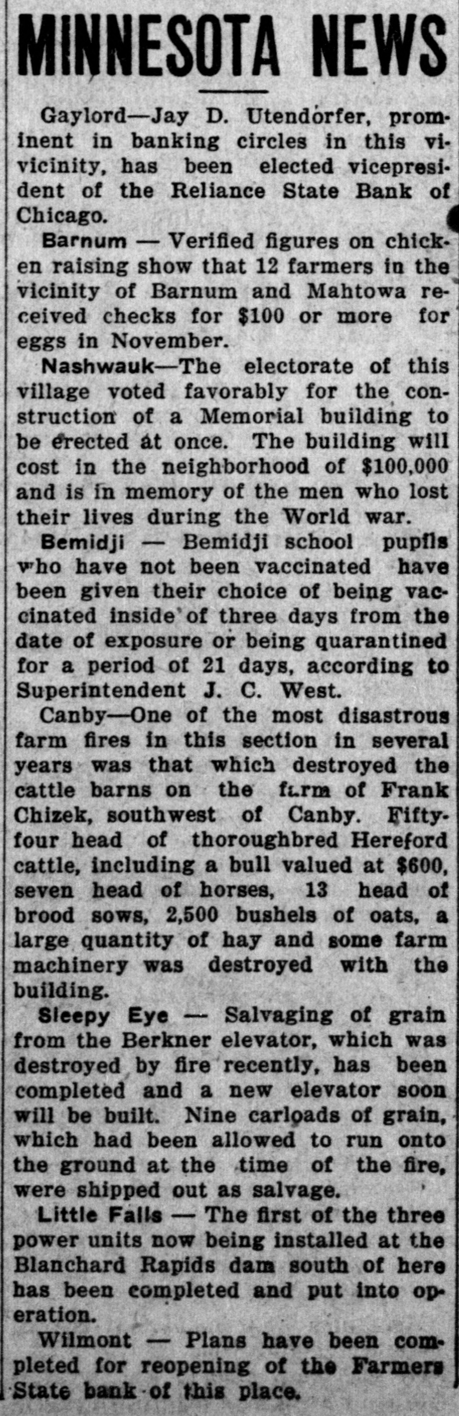 MINNESOTA NEWS Gaylord-Jay D. Utendorfer, prominent in banking circles in this v1. vicinity, has been elected viceprest. dent of the Reliance State Bank of Chicago. Barnum - Verified figures on chicken raising show that 12 farmers in the vicinity of Barnum and Mahtowa received checks for $100 or more for eggs in November. Nashwauk-The electorate of this village voted favorably for the construction of a Memorial building to be erected at once. The building will cost in the neighborhood of $100,000 and is in memory of the men who lost their lives during the World war. Bemidji - Bemidji school pupils who have not been vaccinated have been given their choice of being vaecinated Inside of three days from the date of exposure or being quarantined for a period of 21 days, according to Superintendent J. C. West. Canby-One of the most disastrous farm fires in this section in several years was that which destroyed the cattle barns on the form of Frank Chizek, southwest of Canby. Fifty. four head of thoroughbred Hereford cattle, including a bull valued at $600, seven head of horses, 13 head of brood sows, 2,500 bushels of oats, a large quantity of hay and some farm machinery was destroyed with the building. Sleepy Eye - Salvaging of grain from the Berkner elevator, which was destroyed by fire recently. has been completed and a new elevator soon will be built. Nine carloads of grain, which had been allowed to run onto the ground at the time of the fire, were shipped out as salvage. Little Falls - The first of the three power units now being installed at the Blanchard Rapids dam south of here has been completed and put into of eration. Wilmont - Plans have been completed for reopening of the Farmers State bank of this place.