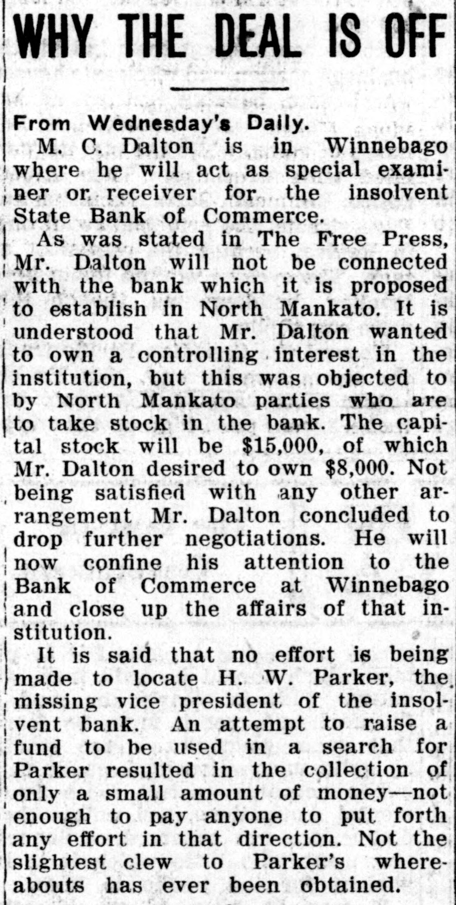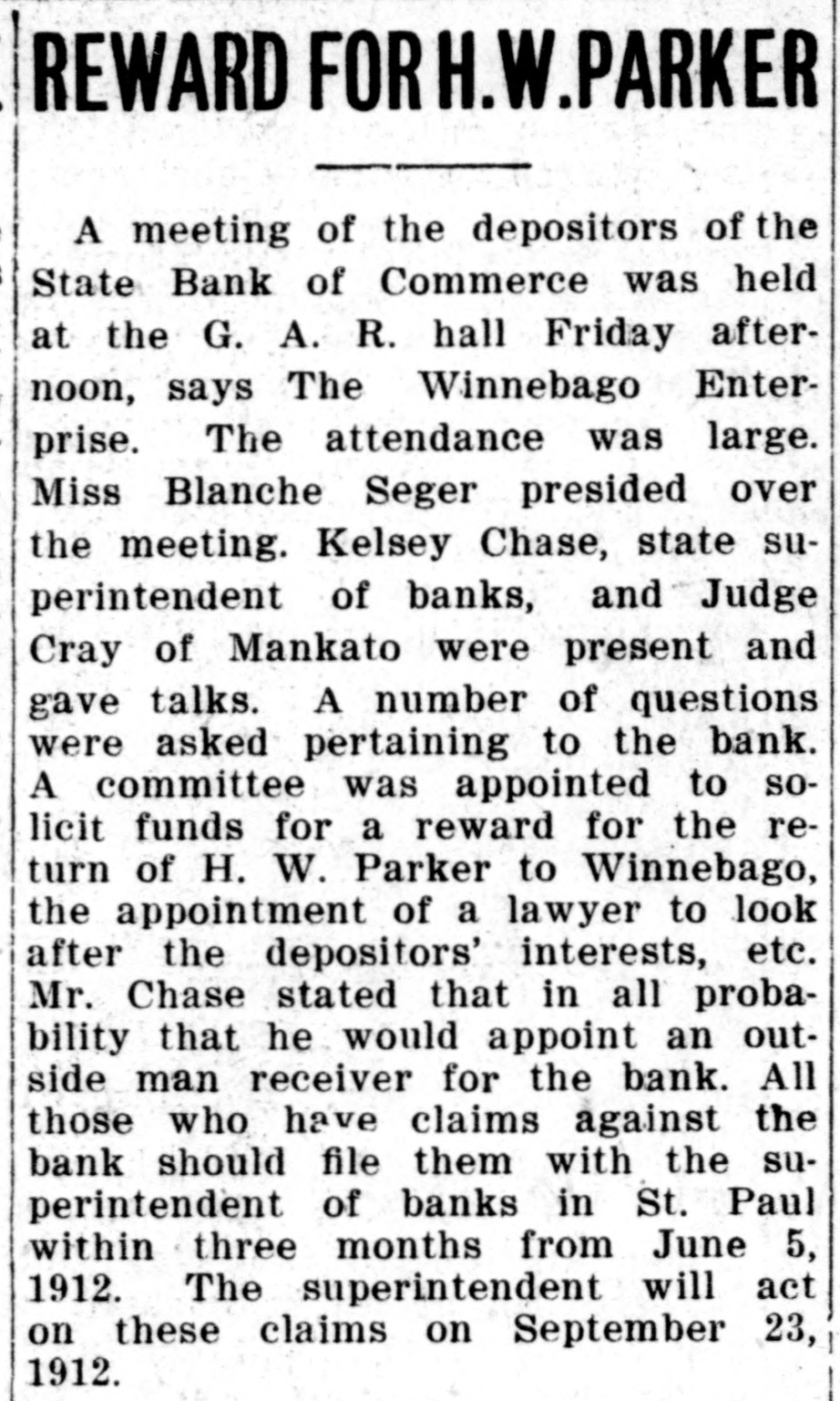 Winnebago Enterprise: Thron Lien, Alex. Eckel, W. P. Wallace and Harry Muir went to St. Paul Wednesday morning and had an interview with State Superintendent of Bank Chase, in regard to the reopening of the State Bank of Commerce. An Iowa banker stands ready to take over the bank and run it, providing certain conditions are complied with. Mr. Chase is expected here next Thursday to go over the situation. At this time the outlook for reopening the bank is favorable.