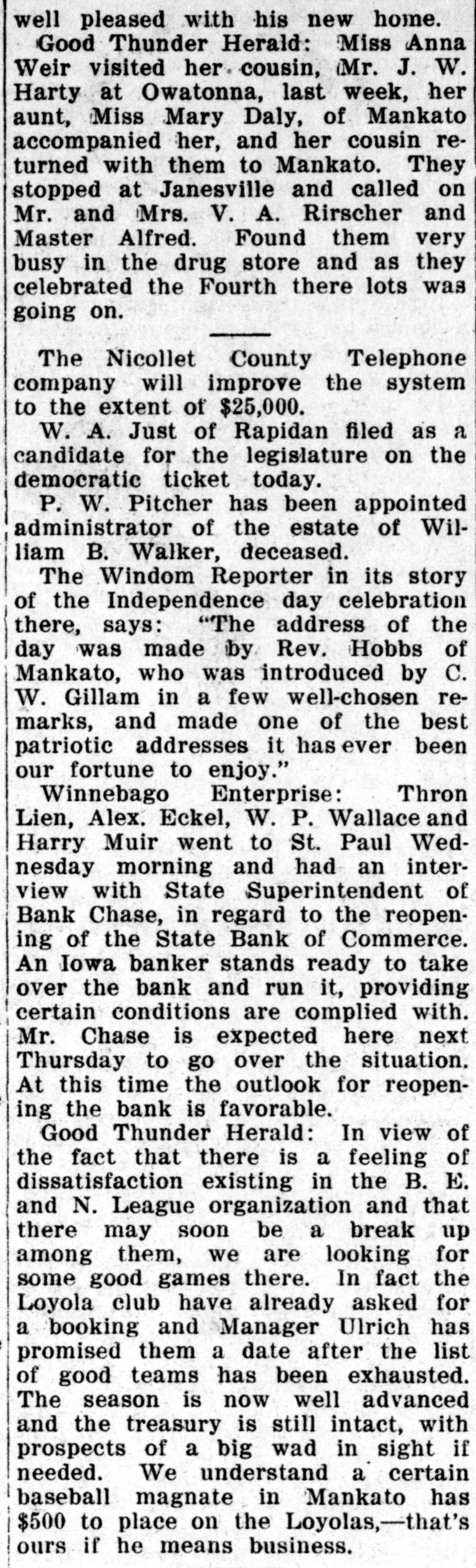 Good Thunder Herald: Miss Anna Weir visited her cousin, Mr. J. W. Harty at Owatonna, last week, her aunt, Miss Mary Daly, of Mankato accompanied her, and her cousin returned with them to Mankato. They stopped at Janesville and called on Mr. and Mrs. V. A. Rirscher and Master Alfred. Found them very busy in the drug store and as they celebrated the Fourth there lots was going on.