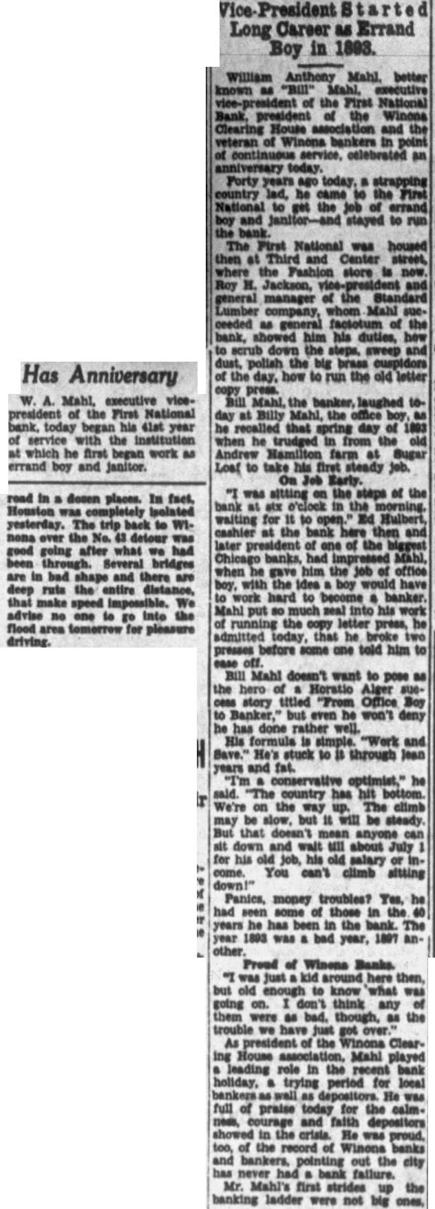 Has Anniversary W. A. Mahl, executive vicepresident of the First National bank, today began his 41st year of service with the institution at which he first began work as errand boy and janitor. read in a dozen places. In fact, Houston was completely isolated yesterday. The trip back to WInona over the No. 43 detour was good going after what we had been through. Several bridges are in bad shape and there are deep ruts the entire distance, that make speed impossible. We advise no one to go into the flood area tomorrow for pleasure driving. Long Career as Errand Boy in 1893. William Anthony Mahl. better known as "Bill" Mahl. executive vice-president of the First National Bank, president of the Winons Clearing House association and the veteran of Winona bankers in point of service, celebrated an anniversary today. Forty years ago today, a strapping country lad, he came to the First National to get the job of errand boy and Janitor-and stayed to run the The First National was housed then at Third and Center street, where the Fashion store is now Roy H. Jackson, and general manager of the Standard Lumber company, whom Mahl sueceeded as general factotum of the bank, showed him his duties, how to scrub down the steps, sweep and dust, polish the big brass of the day. how to run the old letter copy press. Bill Mahl, the banker, laughed today at Billy Mahl, the office boy, he recalled that spring day of 1893 when he trudged in from the old Andrew Hamilton farm at Sugar Loaf to take his first steady job. On Job Early. "I was sitting on the steps of the bank at six o'clock in the morning. waiting for It to open." Ed Hulbert cashier at the bank here then and later president of one of the biggest Chicago banks, had Mahl, when he gave him the job of office boy, with the idea boy would have to work hard to become . banker. Mahl put so much real into his work of running the copy letter press, he admitted today, that he broke two presses before some one told him to case off. Bill Mahl doesn't want to pose as the hero of Horatio Alger suecess story titled "From Office Boy to Banker,' but even he won't deny he has done rather well. His formula is simple. "Work and Save." He's stuck to is through Jean years and fat. "I'm conservative optimist," he said. "The country has hit bottom. We're on the way up. The climb may be slow, but It will be steady. But that doesn't mean anyone can sit down and wait till about July for his old job, his old salary or income. You can't climb sitting down!" Panics, money troubles? Yes, he had seen some of those in the years he has been in the bank. The year 1893 was a bad year, 1897 an- Proud of Winons Banks. "I was just a kid around here then, but old enough to know what was going on. don't think any them were as bad. though, as the trouble we have just got over. As president of the Winona Clearing House association, Mahl played leading role in the recent bank holiday, a trying period for local bankers as well as depositors. He was full of praise today for the calmness, courage and faith depositors showed in the crisis. He was proud. too, of the record of Winons banks and bankers. pointing out the city has never had bank failure. Mr. Mahl's first strides up the banking ladder were not big ones,