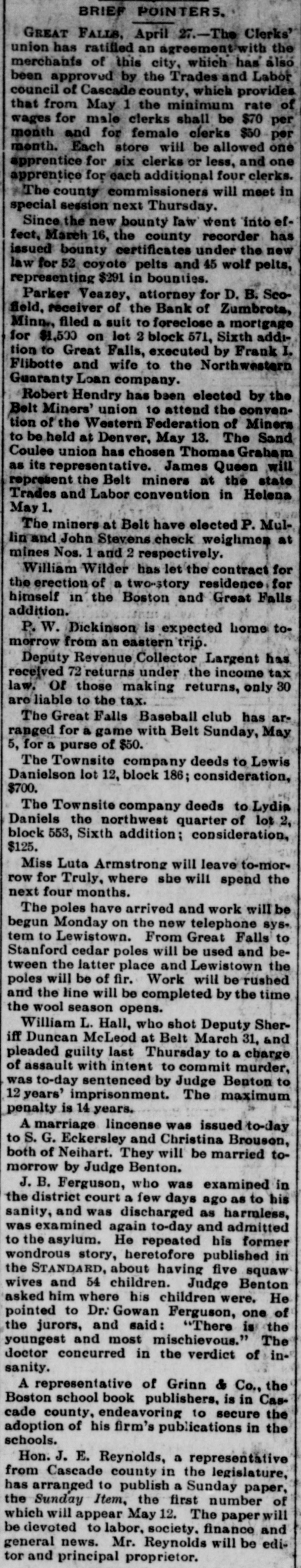 BRIEF POINTERS. GREAT FALLS, April 27.-The Clerks' union has ratified an agreement with the merchants of this city, which has also been approved by the Trades and Labor council of Cascade county, which provides that from May 1 the minimum rate of wages for male clerks shall be $70 per month and for female clerks $50 per month. Each store will be allowed one apprentice for six clerks or less, and one apprentice for each additional four clerks. The county commissioners will meet in special session next Thursday. Since the new bounty law went into effect, March 16, the county recorder has issued bounty certificates under the new law for 52 coyote pelts and 45 wolf pelts, representing $291 in bounties. Parker Veazey, attorney for D. B. Seofield, receiver of the Bank of Zumbrota, Minn, filed a suit to foreclose a mortgage for $1,500 on lot 2 block 571, Sixth addition to Great Falls, executed by Frank I. Flibotte and wife to the Northwestern Guaranty Loan company. Robert Hendry has been elected by the Belt Miners' union to attend the convention of the Western Federation of Miners to be held at Denver, May 13. The Sand Coulee union has chosen Thomas Graham as its representative. James Queen will represent the Belt miners at the state Trades and Labor convention in Helena May 1. The miners at Belt have elected P. Mullin and John Stevens check weighmen at mines Nos. 1 and 2 respectively. William Wilder has let the contract for the erection of a two-story residence for himself in the Boston and Great Falls addition. P. W. Dickinson is expected home tomorrow from an eastern trip. Deputy Revenue Collector Largent has received 72 returns under the income tax law. Of those making returns, only 30 are liable to the tax. The Great Falls Baseball club has arranged for a game with Belt Sunday, May 5, for a purse of $50. The Townsite company deeds to Lewis Danielson lot 12, block 186; consideration, $700. The Townsite company deeds to Lydia Daniels the northwest quarter of lot 2, block 553, Sixth addition; consideration, $125. Miss Luta Armstrong will leave to-morrow for Truly, where she will spend the next four months. The poles have arrived and work will be begun Monday on the new telephone sys. tem to Lewistown. From Great Falls to Stanford cedar poles will be used and between the latter place and Lewistown the poles will be of fir. Work will be rushed and the line will be completed by the time the wool season opens. William L. Hall, who shot Deputy Sheriff Duncan McLeod at Belt March 31, and pleaded guilty last Thursday to a charge of assault with intent to commit murder, was to-day sentenced by Judge Benton to 12 years' imprisonment. The maximum penalty is 14 years. A marriage lincense was issued to-day to S. G. Eckersley and Christina Brouson, both of Neihart. They will be married tomorrow by Judge Benton. J. B. Ferguson, who was examined in the district court a few days ago as to his sanity, and was discharged as harmless, was examined again to-day and admitted to the asylum. He repeated his former wondrous story, heretofore published in the STANDARD, about having five squaw wives and 54 children. Judge Benton asked him where his children were. He pointed to Dr. Gowan Ferguson, one of the jurors, and said: "There is the youngest and most mischievous." The doctor concurred in the verdict of insanity. A representative of Grinn & Co., the Boston school book publishers, is in Cascade county, endeavoring to secure the adoption of his firm's publications in the schools. Hon. J. E. Reynolds, a representative from Cascade county in the legislature, has arranged to publish a Sunday paper, the Sunday Item, the first number of which will appear May 12. The paper will be devoted to labor, society. finance and general news. Mr. Reynolds will be editor and principal proprietor.