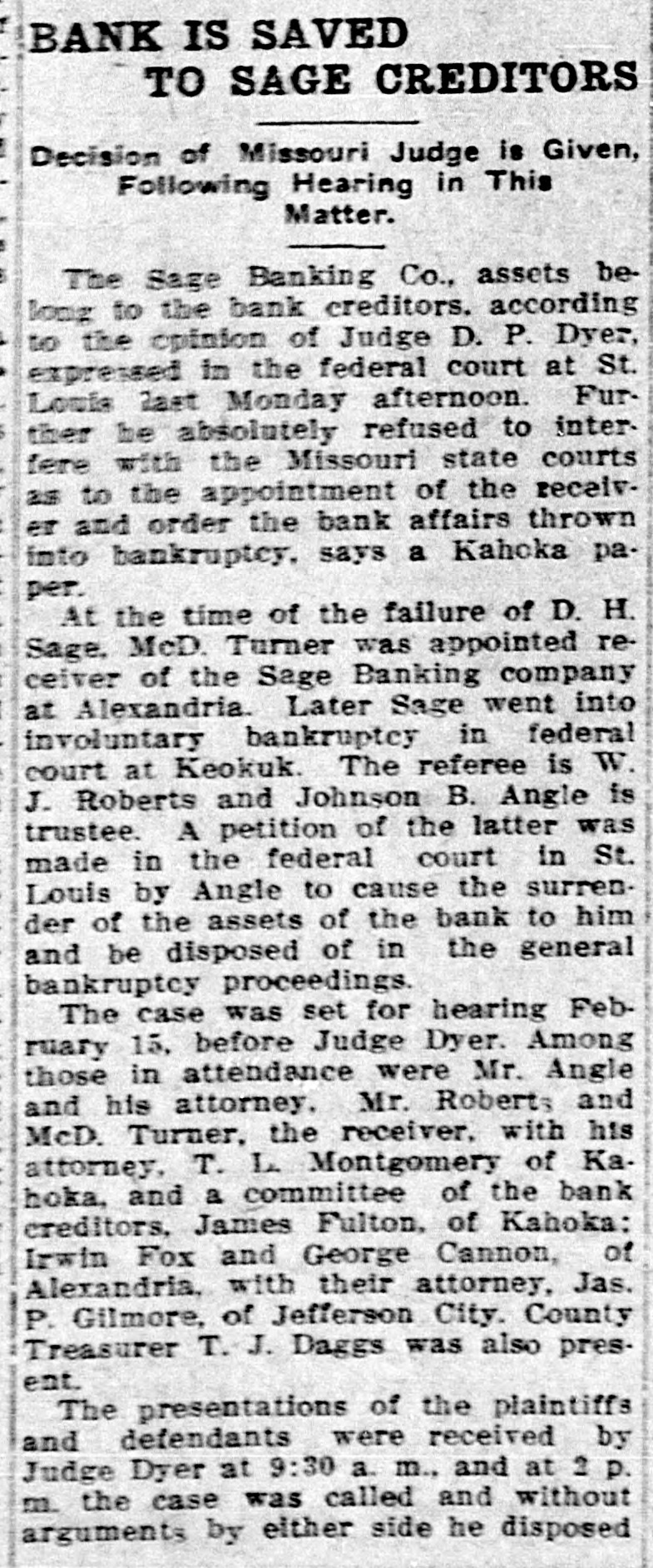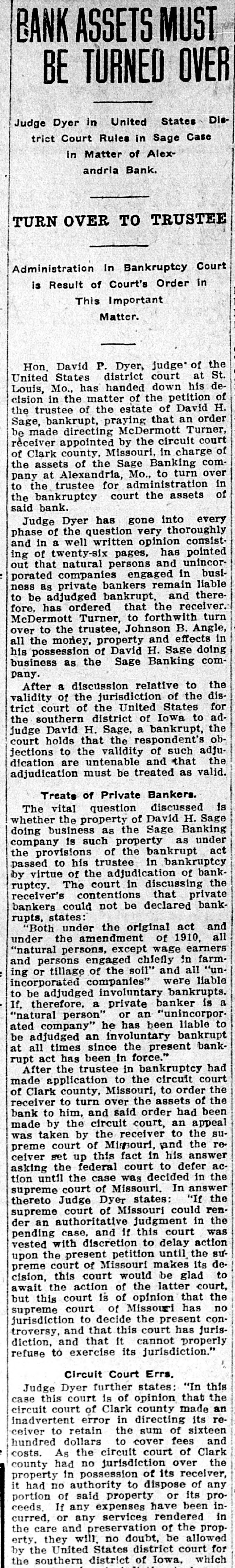 Hon, David P. Dyer, judge of the United States district court at St. Louis, Mo., has handed down his decision in the matter of the petition of the trustee of the estate of David H. Sage, bankrupt, praying that an order be made directing McDermott Turner, receiver appointed by the circuit court of Clark county, Missouri, in charge of the assets of the Sage Banking company at Alexandria, Mo., to turn over to the trustee for administration in the bankruptcy court the assets of said bank.