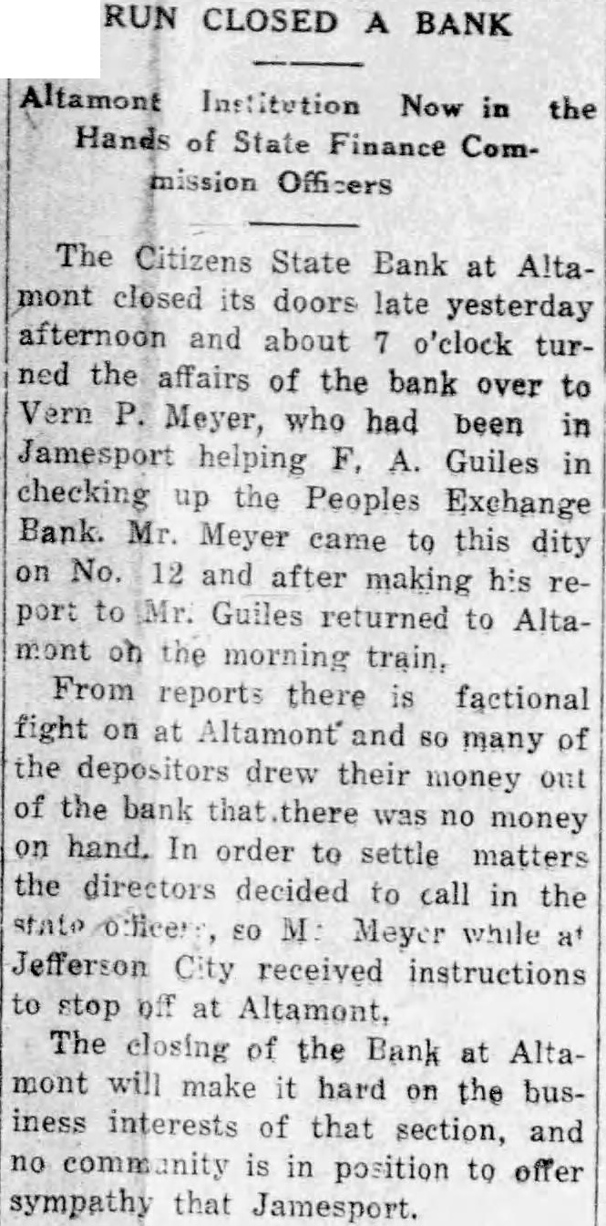 RUN CLOSED A BANK Altamont Institution Now in the Hands of State Finance Commission Officers The Citizens State Bank at Altamont closed its doors late yesterday afternoon and about 7 o'clock turned the affairs of the bank over to Vern P. Meyer, who had been in Jamesport helping F, A. Guiles in checking up the Peoples Exchange Bank. Mr. Meyer came to this dity on No. 12 and after making his report to Mr. Guiles returned to Altamont on the morning train, From reports there is factional fight on at Altamont and SO many of the depositors drew their money out of the bank that there was no money on hand. In order to settle matters the directors decided to call in the Jefferson City received instructions to stop off at Altamont, The closing of the Bank at Altamont will make it hard on the business interests of that section, and no community is in position to offer sympathy that Jamesport.
