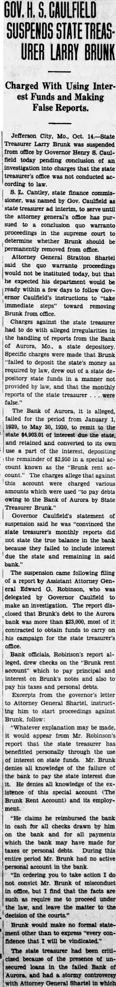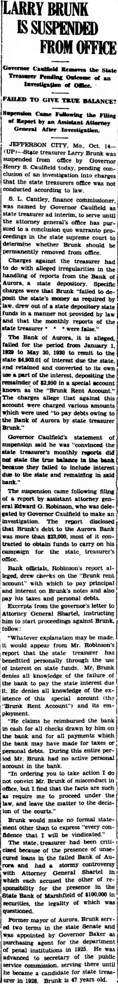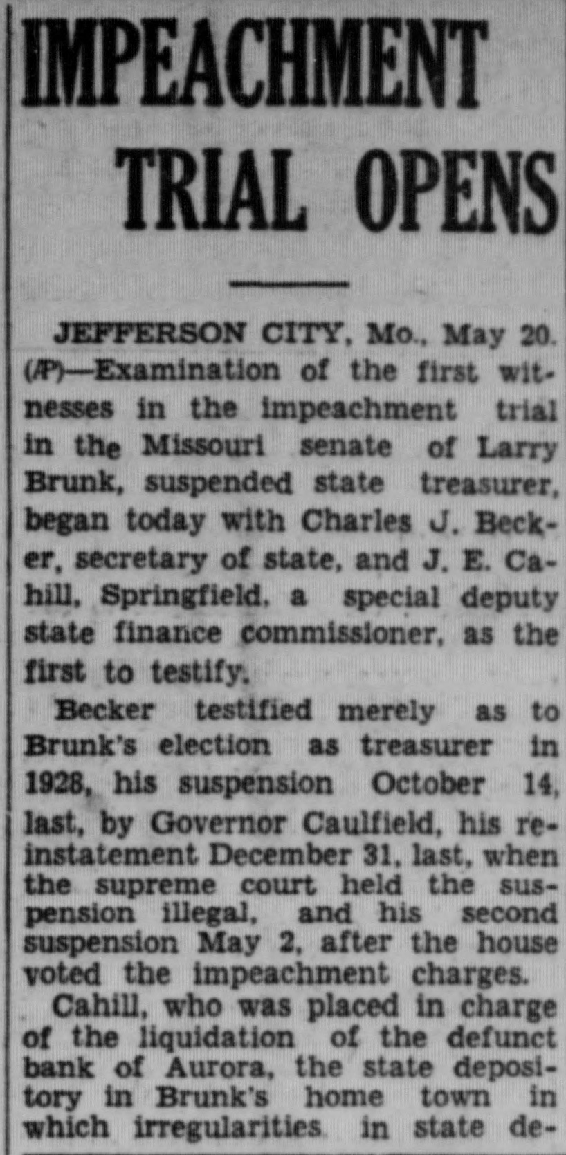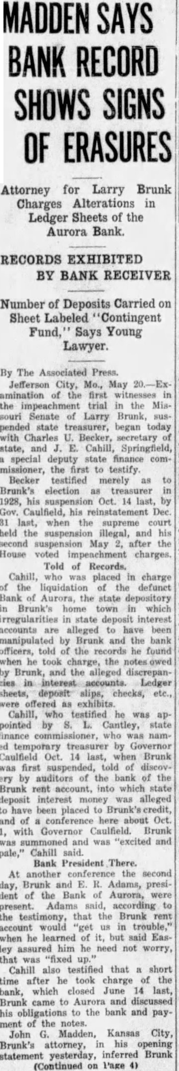 By The Associated Press. Jefferson City, Mo., May amination of the first witnesses the impeachment trial in the Missouri Senate of Larry Brunk, suspended state treasurer, began today with Charles Becker, secretary state, and Cahill, Springfield, special deputy state finance commissioner, the first to testify. Becker testified merely as Brunk's election as treasurer 1928, his suspension Oct. 14 last, by Gov. Caulfield, his reinstatement Dec. 31 last, when supreme court held the suspension illegal, and second suspension May after the House voted impeachment charges. Told of Records. Cahill, who was placed in charge the liquidation of the defunct Bank of Aurora, the state depository Brunk's home town which irregularities in state deposit interest accounts are alleged to have been manipulated by Brunk and the bank officers, told the records he found when he took charge, the Brunk, and the alleged discrepancies in accounts. Ledger sheets, deposit slips, checks, etc., were offered exhibits. Cahill, who testified he was pointed by L. Cantley, state finance commissioner, who was named temporary treasurer by Governor Caulfield Oct. 14 last, when Brunk was first suspended, told of discovery by auditors of the bank of the Brunk rent account, into which state deposit interest money was alleged to have been placed to and of conference here about Oct. with Governor Caulfield. Brunk summoned and was "excited and Cahill said. Bank President There. At another conference the second day, Brunk and R. Adams, president of the Bank of Aurora, were present. Adams said, according to the testimony, that the Brunk rent account would "get us in trouble," when he learned of it, but said Easley assured him he need not worry, that was "fixed Cahill also testified that short time after he took charge of the bank, which closed June 14 last, Brunk came to Aurora and discussed his obligations to the bank and payment the notes. John Madden, Kansas City, Brunk's in his opening attorney, inferred Brunk statement yesterday, (Continued Page
