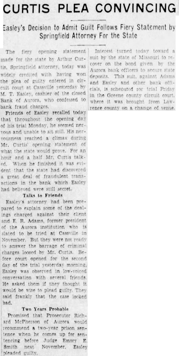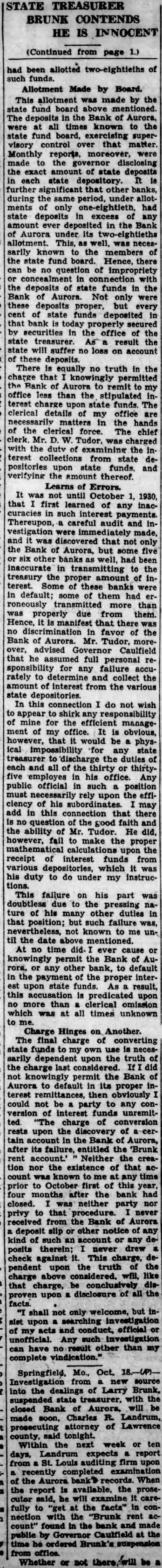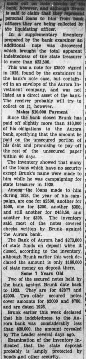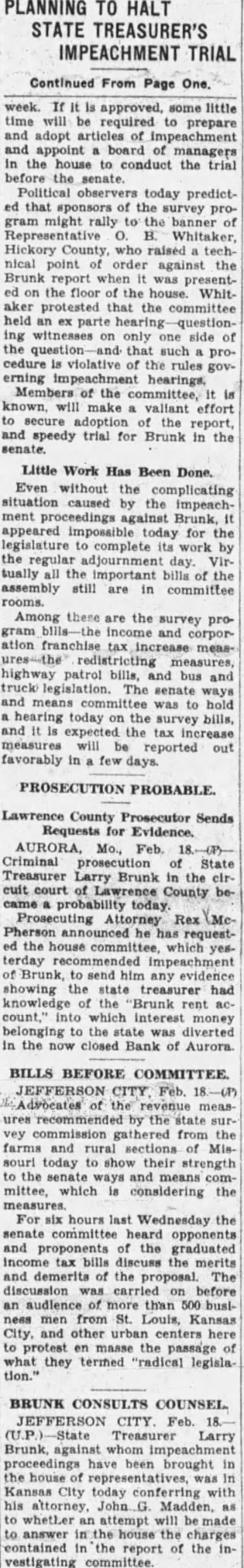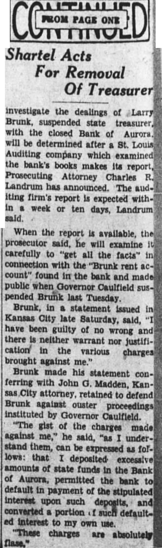 By The Associated Press. Jefferson City, Mo., May amination of the first witnesses the impeachment trial in the Missouri Senate of Larry Brunk, suspended state treasurer, began today with Charles Becker, secretary state, and Cahill, Springfield, special deputy state finance commissioner, the first to testify. Becker testified merely as Brunk's election as treasurer 1928, his suspension Oct. 14 last, by Gov. Caulfield, his reinstatement Dec. 31 last, when supreme court held the suspension illegal, and second suspension May after the House voted impeachment charges. Told of Records. Cahill, who was placed in charge the liquidation of the defunct Bank of Aurora, the state depository Brunk's home town which irregularities in state deposit interest accounts are alleged to have been manipulated by Brunk and the bank officers, told the records he found when he took charge, the Brunk, and the alleged discrepancies in accounts. Ledger sheets, deposit slips, checks, etc., were offered exhibits. Cahill, who testified he was pointed by L. Cantley, state finance commissioner, who was named temporary treasurer by Governor Caulfield Oct. 14 last, when Brunk was first suspended, told of discovery by auditors of the bank of the Brunk rent account, into which state deposit interest money was alleged to have been placed to and of conference here about Oct. with Governor Caulfield. Brunk summoned and was "excited and Cahill said. Bank President There. At another conference the second day, Brunk and R. Adams, president of the Bank of Aurora, were present. Adams said, according to the testimony, that the Brunk rent account would "get us in trouble," when he learned of it, but said Easley assured him he need not worry, that was "fixed Cahill also testified that short time after he took charge of the bank, which closed June 14 last, Brunk came to Aurora and discussed his obligations to the bank and payment the notes. John Madden, Kansas City, Brunk's in his opening attorney, inferred Brunk statement yesterday, (Continued Page