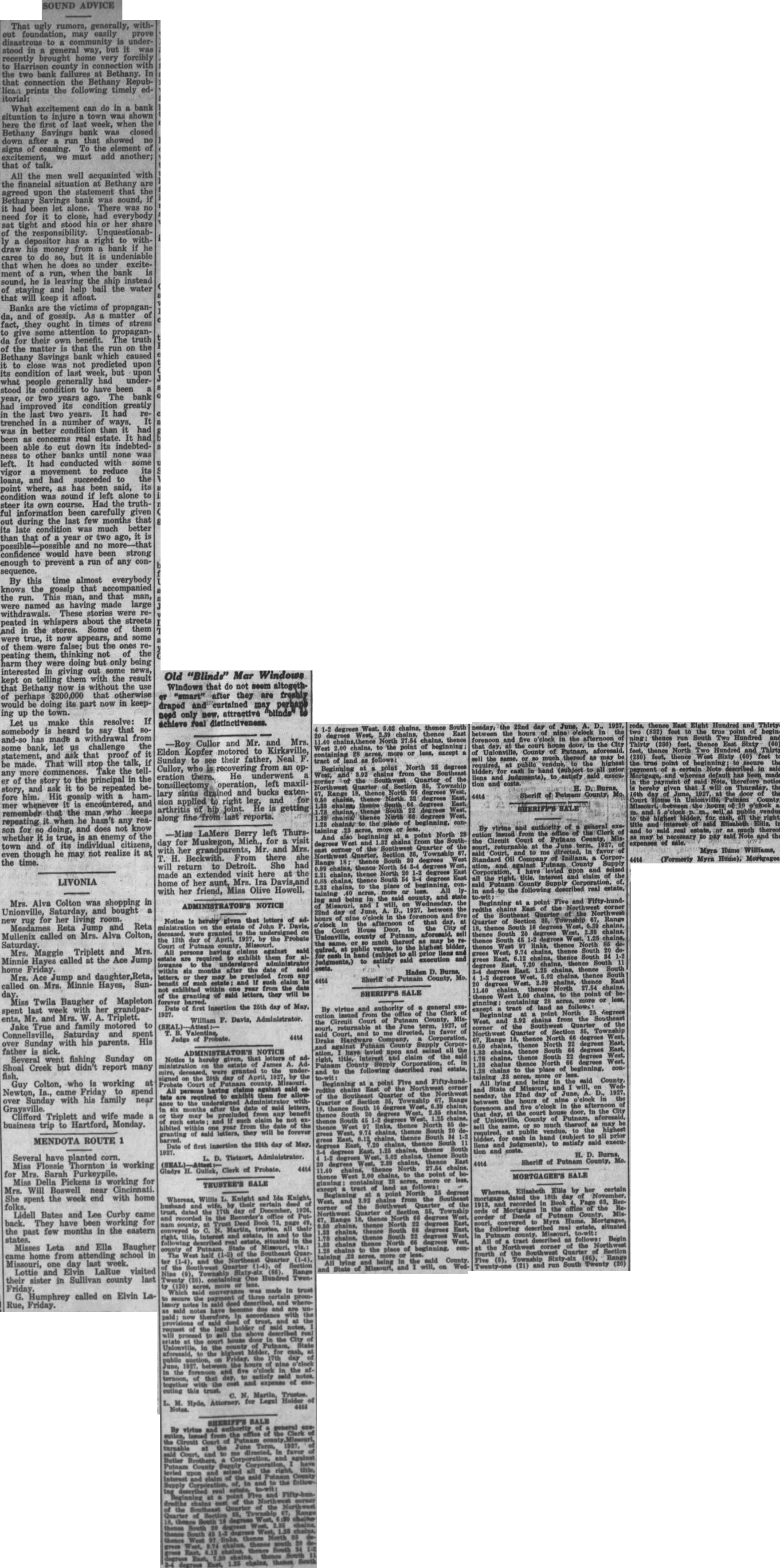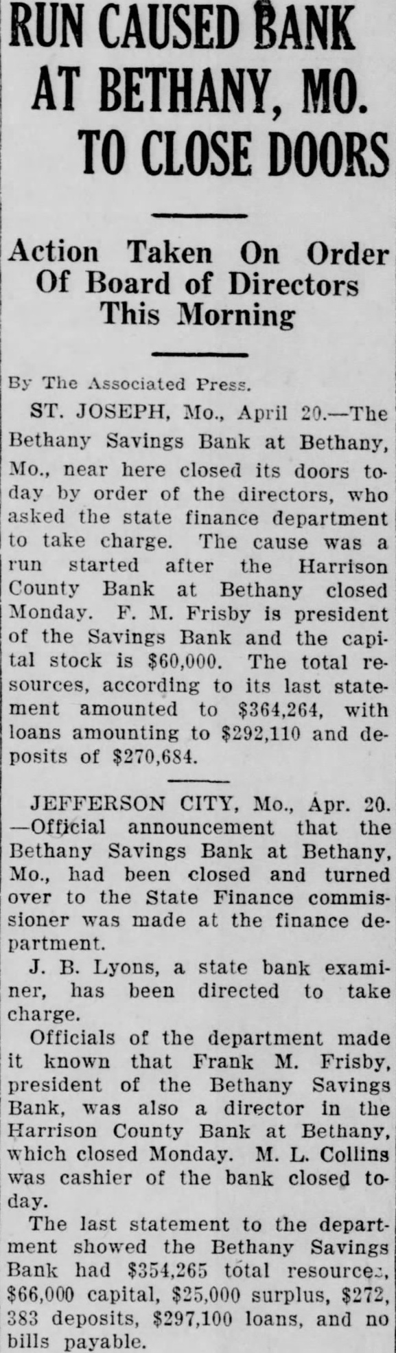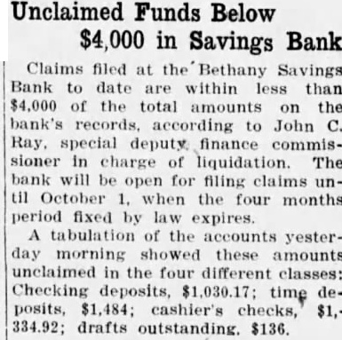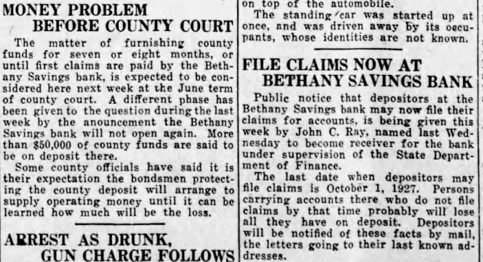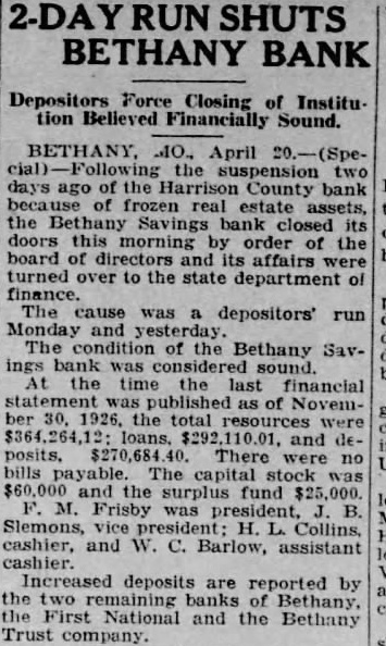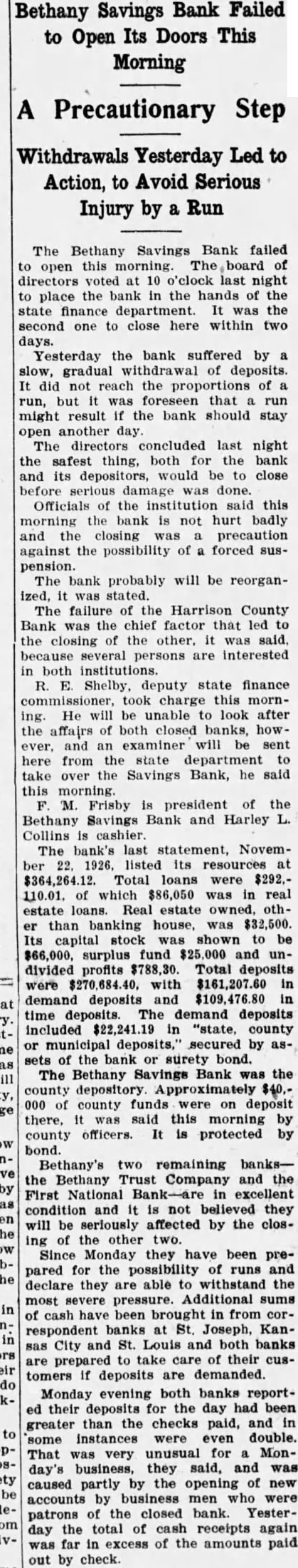 GONE WITHOUT CAUSE. What excitement can do bank situation injure shown here the first of last week, the Bethany Savings bank was closed down after run that showed signs ceasing. the must add that of talk All the with the financial situation Bethany are agreed the that Bethany Savings bank was sound, had been let There was no for had sat tight and stood her share the depositor has right to withdraw his money from bank he cares do but undeniable that when he does under excitement of run, the bank sound, the ship instead staying and help bail the water that Banks are the victims of propaganda, and of gossip. matter fact, they ought times of stress to give some attention propaganda for their own benefit. The matter that the run the Bethany Savings bank was predicated upon its condition of last week, but people generally had understood its condition been two years, The its condition greatthe last two years. had trenched, number of ways. was in better condition than had been SAME DIRECTORS DON'T AFFECT. concerns real estate. had been There seems somewhat to cut down its indebtedness other general impression about Bethany that banks until none was left. It had con-