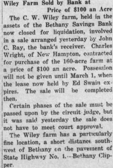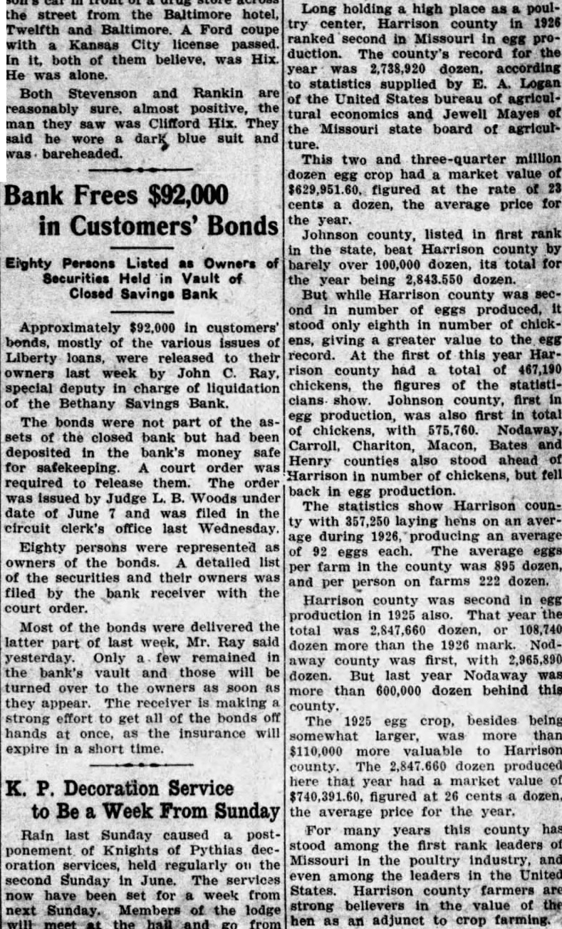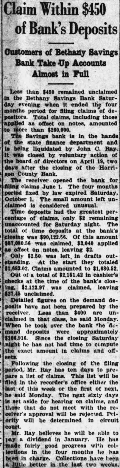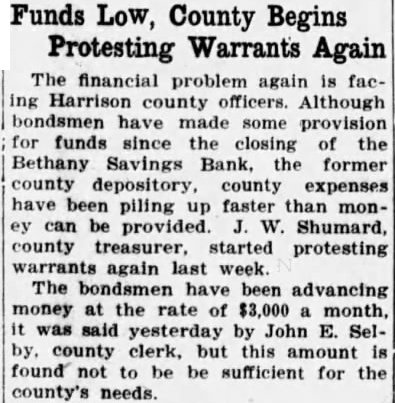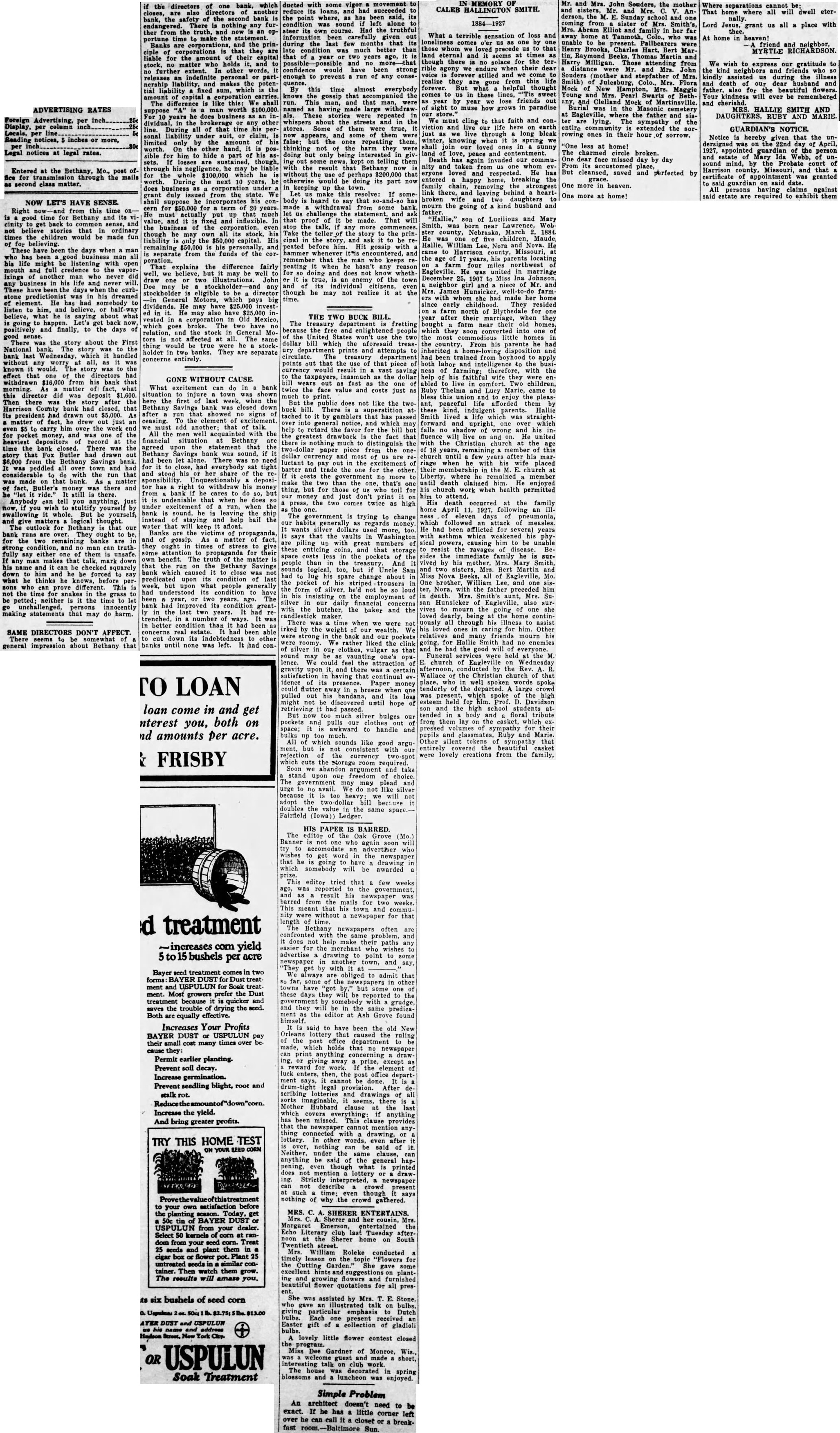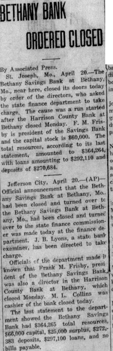 NOW LET'S HAVE SENSE. Right this time is Bethany and its sense, and not stories that ordinary times the children would be made fun for believing. These the days when man has been man his life might be listening with open mouth and full credence the vaporizings of another man who never any business in his life and never will. These days the curbpredictionist in his dreamed He had listen him, and believe, or believe, what he saying about what happen. Let's get now, positively and finally, to the days of good sense. There the story about the First National bank. The story was bank last Wednesday, which it handled without any worry at all, as known would. The story was to the effect that of the directors had withdrawn $16,000 from his bank that morning. matter fact, what this director did was deposit $1,600. Then the story after the Harrison County bank had closed, that its president had drawn out $5,000. As matter of fact, he drew out just $5 carry him the week end for pocket money, and was one of the heaviest depositors record at the time the bank closed. There was the story that Fox Butler had drawn out $6,000 from the Bethany Savings bank. was peddled all over town and had considerable the run that that bank. As matter fact, Butler's was there and "let ride.' still is there. Anybody can tell you just now. you wish stultify yourself swallowing it whole. But be yourself, and give matters logical thought. outlook for Bethany that our bank are over. They ought to be, for are strong and no man can truthfully say either one them unsafe. any man makes that talk, mark down his name and be checked squarely down forced to say what he thinks percan prove different. This not the time snakes the grass be petted: neither is the time to let unchallenged, persons innocently making statements may do harm. which ducted with vigor movement to if the directors of one some reduce its loans, and succeeded closes, are directors of another the bank the where, has been said, its bank, the of fur- was sound left alone There any steer its course. Had the truthful ther from the truth, and now an opinformation been carefully given out portune time to make the statement. and the prin- during the last few its Banks are corporations, that are condition was much better corporations they liable for the amount capital that year years ago, holds and possible- and stock, no matter extent. other words, confidence would have strong releases an indefinite personal or part- enough to prevent run of any consenership liability, and makes the poten- quence. which the By this time almost everybody tial liability sum, carries. knows the gossip that the of capital corporation like this: We run. This man, and that The man worth $100,000. named having made large withdraw suppose For he business as These stories were repeated 10 dividual, brokerage any other whispers about the streets and in the of time stores. Some of them true, it During that personal liability under suit, or claim, now appears, limited only by amount of his ones them, worth. On the pos- thinking the harm sible for him hide part of his doing but only interested in sets. losses though, some telling them through his negligence, may be liable the result that Bethany for the whole $100,000 which he without the use perhaps $200,000 that worth. During the 10 years, he otherwise doing its part now does keeping duly from the We Let this resolve: If someshall suppose incorporates his con- body is heard say that so-and-so has cern for $50,000 term 20 years. made withdrawal from some bank, He actually put that let us challenge the must and it is fixed and inflexible. that proof be made. That will the of the the talk, if any more though he may Take the the prinliability the $50,000 capital. His cipal the remaining $50,000 his and peated before Hit gossip with is separate from the funds of the cor- hammer encountered, and poration. remember that the who keeps That explains the difference fairly peating he hasn't any reason we believe, be for and whethone two illustrations. John true, the town Doe be any and its stockholder eligible director though he may not realize it at General Motors, which pays big time. dividends. He may have $25,000 ed in He also invested Old which goes The and the Motors not affected at The same thing would be he holder They are separate concerns entirely.