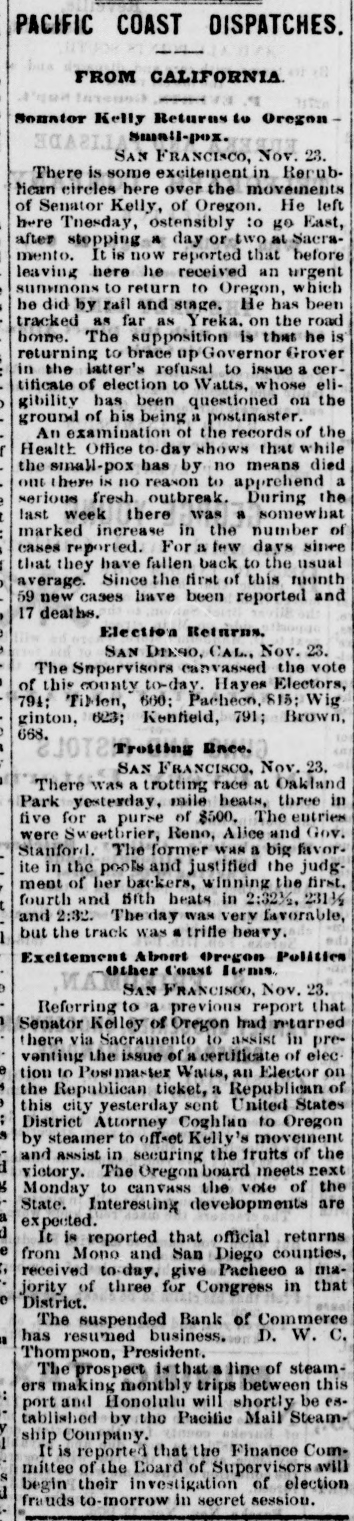 PACIFIC COAST DISPATCHES. FROM CALIFORNIA Sonntor Kelly Returns to Oregon small-pox. SAN FRANCISCO, Nov. 23. There is some excitement in Rerublican circles here over the movements of Senator Kelly, of Oregon. He left here Thesday, ostensibly to go East, after stopping a day or two at Sacramento. It is now reported that before leaving here he received an urgent summons to return to Oregon, which he did by rail and stage. He has been tracked as far as Yreka. on the road home. The supposition is that he is returning to brace up Governor Grover in the latter's refusal to issue a certiticate of election to Watts, whose eli) gibility has been questioned on the ground of his being a postinaster. An examination of the records of the f Health Office to day shows that while the small-pox has by no means died out there is no reason to apprehend a e serious fresh outbreak. During the last week there was a somewhat marked increase in the number of cases reported. For a few days since that they have fallen back to the usual average. Since the first of this month 59 new cases have been reported and 17 deaths. Election Returns. SAN DIE:40, CAL., Nov. 23. The Sapervisors canvassed the vote ) of this county to-day. Hayes Electors, 794; Tillen, 660: Pacheco, 815: Wig ginton, 623; Kenfield, 791; Brown, , 668. Trolling Rnce. SAN FRANCISCO. Nov. 23. There was a trotting race at Oakland Park yesterday, mile heats, three in five for a purse of $500. The entries were Sweetbrier, Reno, Alice and Gov. Stanford. The former was a big favor. ite in the pools and justified the judgment of her backers, winning the first. fourth and Bifth heats in 2:32 1/2. 2311/2 t and 2:32. The day was very favorable, but the track was n tritle heavy. 1 Excitement About Oregon Politics Other Coast Items. 0 SAN FRANCISCO, Nov. 23. Referring to a previous report that 1 Senator Kelley of Oregon had retarned there via Sacramento to assist in preventing the issue of H certificate of elec e tion to Postmaster Walls, an Elector on 4 the Republican ticket, a Republican of , this city yesterday sent United States : District Attorney Coghian to Oregon a by steamer to off-et Kelly's movement and assist in securing the truits of the d victory. The Oregon board meets next g Monday to canvass the vote of the State. Interesting developments are a expected. d It is reported that official returns e from Mono and San Diego counties, , received to-day. give Pacheco a majority of three for Congress in that e District. The suspended Bank of Commerce D. W. C. a has resumed business. Thompson, President. The prospect is that a line of steamers making monthly trips between this port and Honolulu will shortly be established by the Pacific Mail Steamy ship Company. I It is reported that the Finance Committee of the Loard of Supervisors will S begin their investigation of election d frauds to-morrow in secret session.