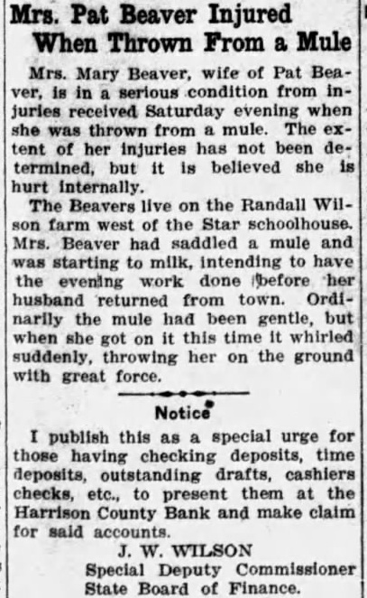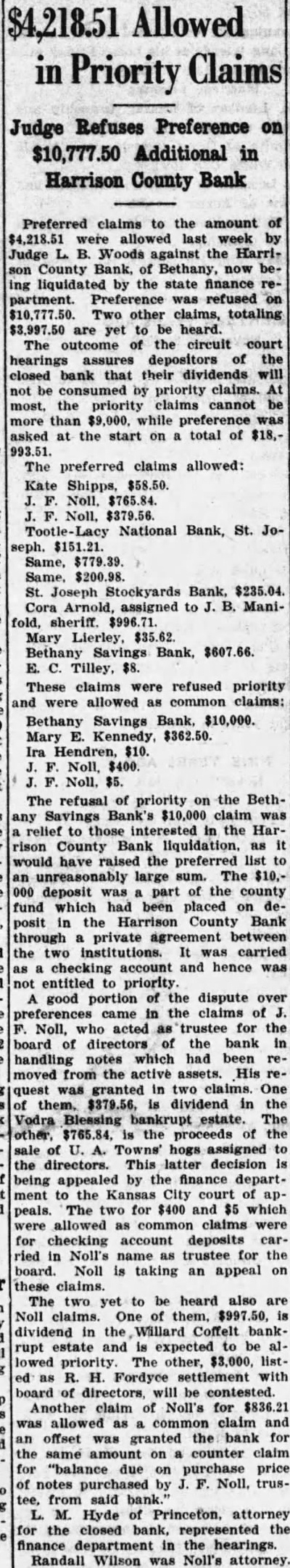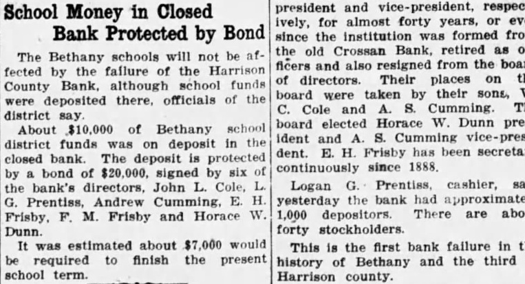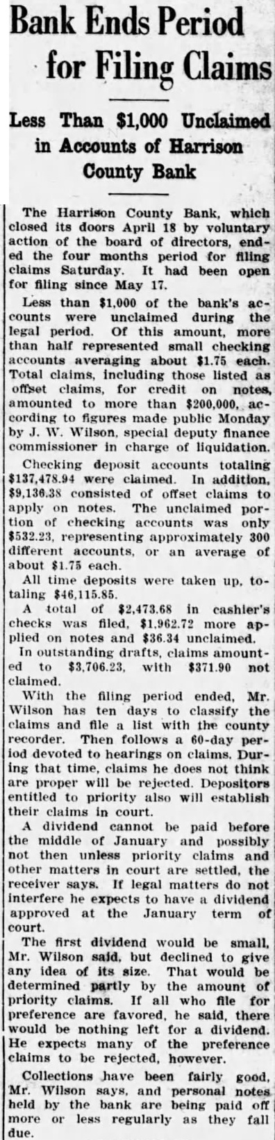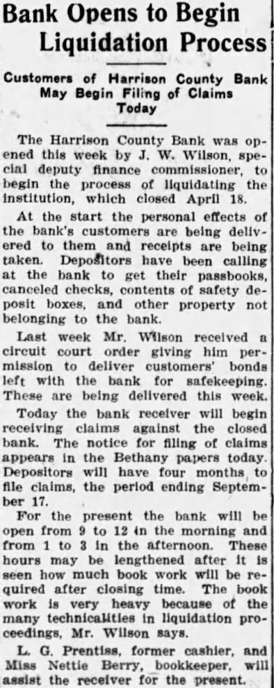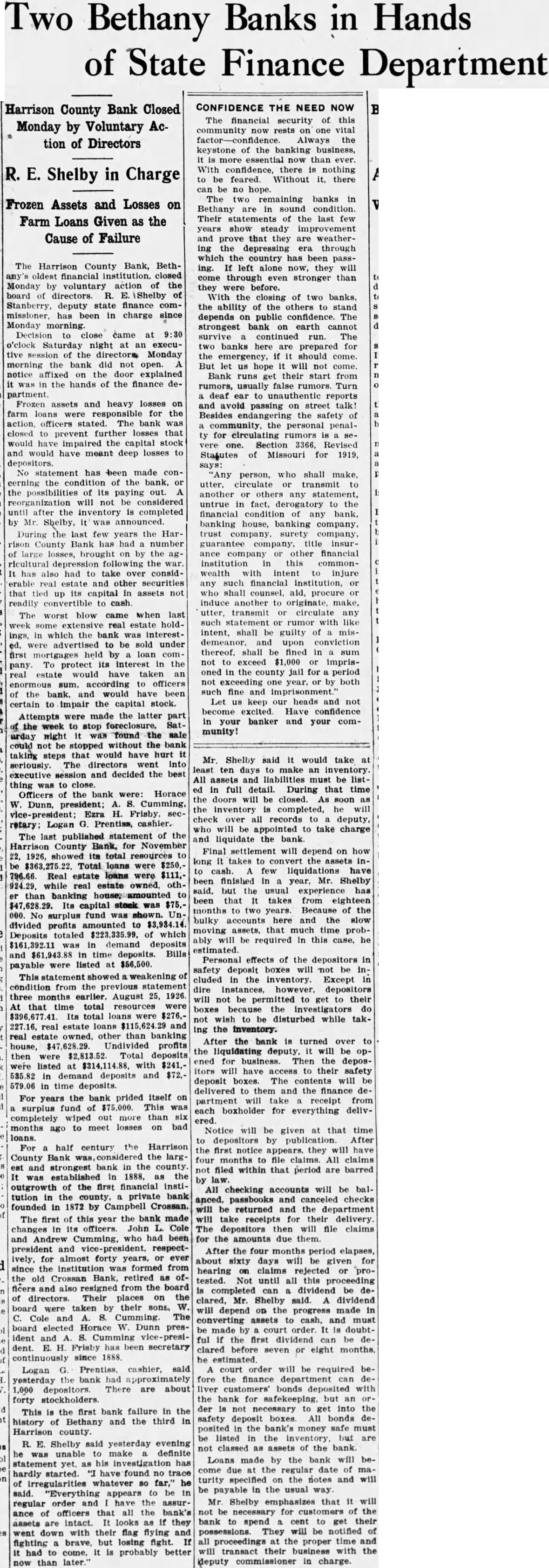 The Harrison County Bank, Betholdest financial institution, closed Monday voluntary action of the board R. of Stanberry, deputy state finance comhas been charge since Monday morning. Decision close came at o'clock Saturday night at executive session the directors Monday morning the bank did not open. notice affixed the door explained the hands of the finance partment. Frozen assets and heavy losses farm loans were responsible for officers stated. The bank closed prevent further losses that would have impaired the capital stock and would have meant deep losses depositors. No statement has been made cerning the condition of the bank, the possibilities of its paying out. reorganization will not be considered until after the inventory completed by Shelby, announced. During the last few years the Harrison County Bank has had number large losses, brought by the ricultural depression following the has had take over considerable real estate and other securities that tied its capital assets not readily convertible to cash. The worst blow came when last week real estate holdings, which the bank interestadvertised to sold under first mortgages held by loan To protect interest the pany. real estate would have taken an according officers the and would have been certain impair the capital stock. Attempts were made the part the week to stop found the sale could not be stopped without the bank taking steps that would have hurt seriously. The directors went into executive session and decided the best close. Officers the bank were: Horace Dunn, Cumming, Ezra Frisby. retary: Logan Prentiss, cashier. The last published statement of the Harrison County for November 22, 1926, its total Total loans were $250,Real estate loans were while real estate oththan banking Its capital stock was No surplus fund shown. divided profits amounted Deposits totaled which demand deposits and time deposits. Bills were listed $56,500. showed weakening condition from the previous three months earlier. August 25, At that time total resources Its total loans real estate loans and real estate owned, other than banking house, Undivided profits then were Total deposits listed $314,114.88, with $241,in demand deposits and $72,579.06 in time deposits. For the bank prided itself years surplus fund of $75,000. This was completely wiped out more than meet losses on bad ago to loans. For half century the Harrison County Bank the largand strongest bank in the 1888, the outgrowth of the first financial institution private founded in 1872 by Campbell Crossan. The first of this year the bank made changes its officers. John Cole Andrew Cumming, who been president and respectively, almost forty years, since the institution formed from old Crossan Bank, retired The said Shelby said yesterday evening unable make definite statement has hardly started. have found no trace irregularities whatever so said. "Everything appears regular order and have the assurance of officers that all the bank's assets are looks they down with their flag fighting brave, but losing fight. had probably better than
