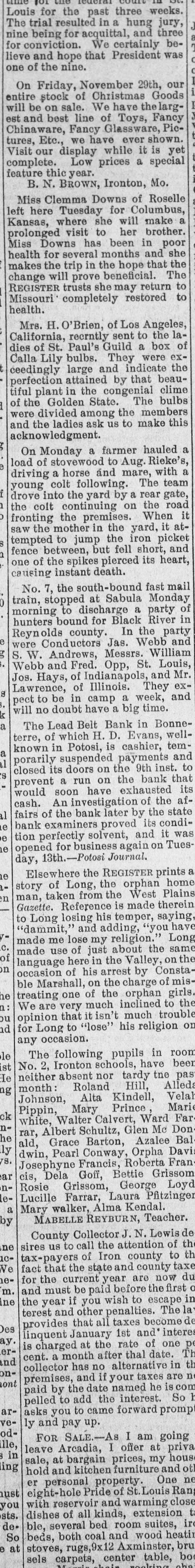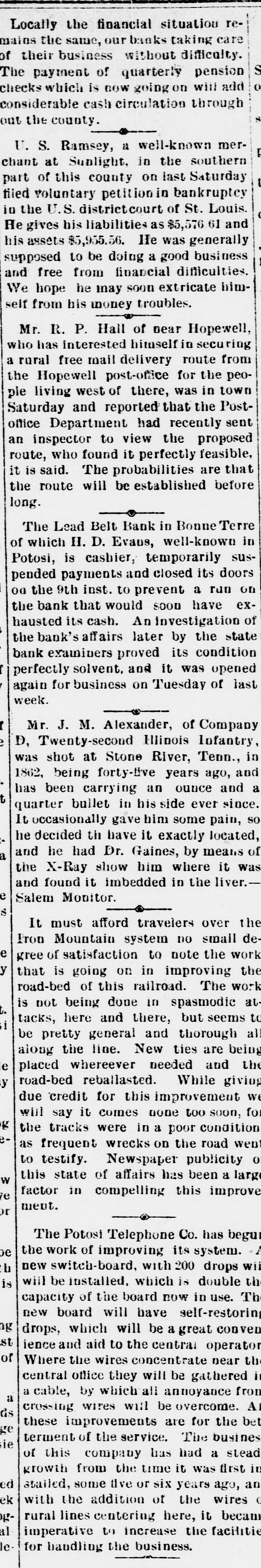 Locally the financial situation remains the same, our banks taking care of their business without difficulty. The payment of quarterly pension checks which is now going on will add considerable cash circulation through out the county. U. S. Ramsey, a well-known merchant at Sunlight, in the southern part of this county on last Saturday filed voluntary petition in bankruptcy in the U.S. districtcourt of St. Louis. He gives his liabilities as $5,576.61 and his assets $5,955.56. He was generally supposed to be doing a good business and free from financial difficulties. We hope he may soon extricate himself from bis money troubles. Mr. R. P. Hall of near Hopewell, who has interested himself in securing a rural free mail delivery route from the Hopewell post-office for the peopie living west of there, was in town Saturday and reported that the Postoffice Department had recently sent an inspector to view the proposed route, who found it perfectly feasible, it is said. The probabilities are that the route will be established before long. The Lead Belt Bank in Bonne Terre of which H. D. Evaus, well-known in Potosi, is cashier, temporarily suspended payments and closed its doors 00 the 9th inst. to prevent a run on the bank that would SOOD have exhausted its cash. An investigation of the bank's affairs later by the state bank examiners proved its condition perfectly solvent. and it was opened again for business on Tuesday of last week. Mr. J. M. Alexander, of Company D, Twenty-second Illinois Infantry, was shot at Stone River, Tenn., in 1862, being forty-tive years ago, and has been carrying an ounce and a t quarter bullet in his side ever since. It occasionally gave him some pain, SO he decided th have it exactly located, a and he had Dr. Gaines, by means the X-Ray show him where it was and found it imbedded in the liver. e Salem Monitor. S It must afford travelers over the Iron Mountain system no small dee gree of satisfaction to note the work y that is going on in improving the road-bed of this railroad. The work is not being done in spasmodic at tacks, here and there, but seems to i be pretty general and thorough all along the line. New ties are being e placed whereever needed and the y road-bed reballasted. While giving due credit for this improvement we will say it comes none too soon, for g the tracks were in a poor condition as frequent wrecks on the road wen to testify. Newspaper publicity o W this state of affairs has been a large e factor in compelling this improve ment. or The Potosi Telephone Co. has begu be the work of improving its system. b new switch-board, with 200 drops wil is will be installed, which is double th capacity of the board now in use. Th new board will have self-restoring ng drops, which will be a great conven st ience and aid to the central operator of Where the wires concentrate near th central office they will be gathered a a cable, by which all annoyance from ds crossing wires will be overcome. A these improvements are for the bet ge terment of the service. The busines ie of this company has had a stead growth from the time it was first in ed stailed, some live or six years ago, an ek with the addition of the wires grural lines centering here, it becam al imperative to increase the facilitie le for handling the business.