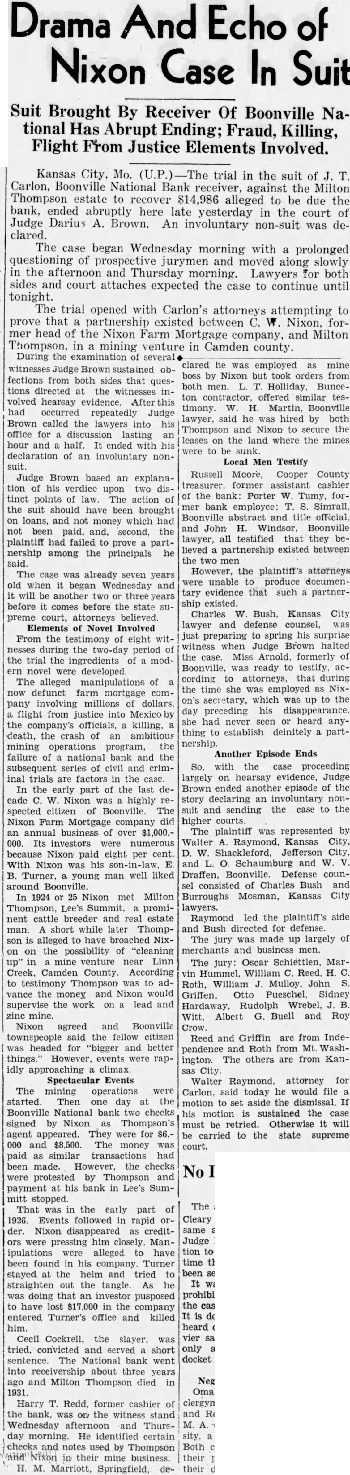 of Nixon Case Suit Suit Brought By Receiver Of Boonville National Abrupt Ending; Fraud, Killing, Flight From Justice Elements Involved. Kansas City, trial in the suit of Carlon, National receiver, against the Milton Thompson estate to recover alleged to be due the bank, ended abruptly here late yesterday in the court of Judge Darius A. Brown. An involuntary non-suit was clared. The case began Wednesday morning with prolonged questioning of prospective jurymen and moved along slowly in the afternoon and Thursday morning. Lawyers for both sides and court attaches expected the case to continue until tonight. The trial opened with Carlon's attorneys attempting to prove that partnership existed between Nixon, mer head of the Nixon Farm Mortgage company, and Thompson, in mining venture in Camden county. of clared Brown sustained boss by fections from both sides that quesboth tions directed the witnesses ton volved hearsay evidence. this timony. had occurred repeatedly Judge lawyer, Brown called the lawyers into office for discussion lasting an leases hour and half. It ended to declaration of an involuntary nonsuit. Russell Judge Brown based an explanatreasurer. tion of verdice upon two of the tinct points of law. The action of the suit should have been brought Boonville loans, and not money which had and been paid, second, the lawyer, plaintiff had failed to prove partlieved nership among the principals he the two said. The case was already years old when began and tary another two ship before comes before the state Charles preme court, attorneys believed. lawyer Elements of Novel Involved From the testimony of eight witness nesses during the period of the the trial the ingredients of modnovel were developed. cording The alleged manipulations of now defunct farm mortgage company involving millions of dollars, day flight from justice she had the company's officials, killing. thing to death, the crash of an ambitious nership. mining operations program, the failure of national bank and subsequent series of civil and criminal trials are factors in the case. largely In the early part the last cade Nixon highly spected citizen of Boonville. The suit and Nixon Farm Mortgage company did higher an annual business of over Its investors Walter because Nixon paid eight per cent. With Nixon his son-in-law, and Turner, young man well liked Draffen, around Boonville. In or Nixon met Milton Burroughs Thompson, Summit. promi- lawyers. nent cattle breeder and estate man. short while later Thompson is alleged to have broached The the possibility "cleaning venture Linn The Camden County. According vin testimony Thompson was to Roth, vance the money and Nixon would supervise the work on lead and zinc mine. Nixon agreed and Boonville Crow. said the fellow citizen townspeople Reed headed for "bigger and better pendence things." However, events were ington. idly approaching climax. sas City. Spectacular Events Walter The mining operations Carlon, started. Then day the motion Boonville National bank two checks his signed by Nixon as Thompson's be must agent appeared. They were be 000 and $8,500. The money court. paid as similar transactions had been made. However, checks protested by Thompson and payment at his bank in Lee's mitt stopped. The That in the early part of 1926. Events followed in rapid der. Nixon disappeared creditwere him closely. Man- Judge pressing ipulations alleged have tion to been found in his company. Turner stayed at the helm and tried to straighten out the tangle. doing that an investor pusposed to have lost in the company entered Turner's office and him. heard Cecil the vier said slayer. tried, convicted and served short only sentence. The National bank went docket receivership about three years ago and Milton Thompson died 1931. Omaha. Harry former cashier of bank, on the witness stand and Wednesday afternoon and Thursday He identified certain sity, and notes used by Thompson Both in their mine business. their Marriott, he employed mine Nixon but took orders from men. Holliday, Bunceoffered similar said he was hired by both Thompson and Nixon to secure the on the land where the mines be sunk. Local Men Testify Cooper County former assistant cashier bank: Porter Tumy, bank employee: Simrall, abstract and title official. John H. Windsor, Boonville all testified that they partnership existed between men the plaintiff's attorneys unable produce evidence that such existed. Kansas City and defense preparing to spring his surprise when Judge Brown halted Miss formerly Boonville, was ready testify. that during the time she was employed Nixwhich was to the preceding his disappearance. never heard establish deinitely part- Another Episode Ends with the case proceeding on hearsay evidence, Judge Brown ended another episode of the story declaring involuntary nonsending the case to the courts. The plaintiff represented Raymond, Kansas City, Shackleford, Jefferson City, Schaumburg and Boonville. Defense counconsisted Charles Bush and Mosman, Kansas City Raymond led the plaintiff's side and Bush directed defense. was made up largely of jury merchants and business men. Oscar MarJury: Hummel, William William Mulloy. John Otto Pueschel. Sidney Rudolph Wrebel, Albert Buell and Roy and Griffin are from IndeRoth from Mt. WashThe others are from attorney for said today he would to set aside the motion sustained the case retried. Otherwise will carried to the state supreme