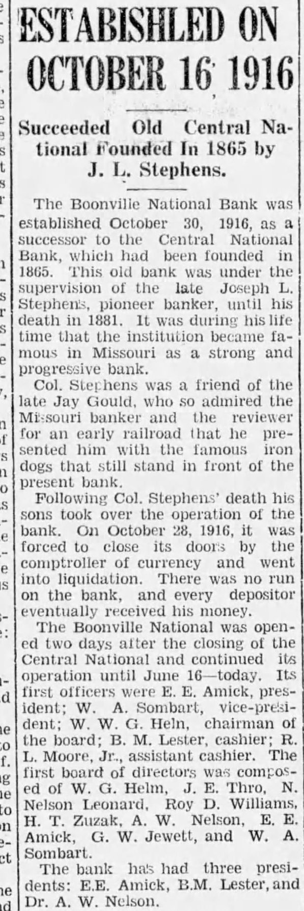 ESTABISHLED OCTOBER 1916 Succeeded Old Central National Founded In 1865 by Stephens. The Boonville National Bank was established October 30, 1916, as successor the Central National Bank, which had been founded 1865. This old bank was under the supervision the late Joseph pioneer banker, until his death 1881. during life time that the institution became famous Missouri strong and progressive bank. Col. was friend of the late Jay Gould, so admired the Missouri and reviewer an early that sented him the famous dogs that still stand in front of the Following Col. Stephens' death his sons took the operation of the bank. On October 28, 1916, forced close its doors by the currency and went There was no run on the bank, and every depositor his money. The was openafter the closing the Central and continued its operation June Its first Amick, president; Sombart, vice-president; Heln, chairman the board; Lester, cashier; Moore, assistant cashier. The first board of directors Helm, Thro, N. Nelson Leonard, Roy H. Zuzak, Nelson, Amick, W. Jewett, and W. The bank has had three presidents: Amick, B.M. Dr. Nelson.