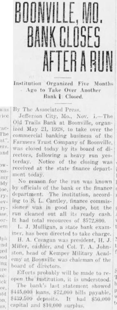 Institution Organized Five Months Ago to Take Over Another Bank Closed. By The Associated Press. Jefferson City, Mo., Nov. Old Trails Bank at Boonville, organized May 1928, take over the commercial banking business of the Farmers Trust Company of Boonville, closed today by board of rectors, following heavy run yesterday. Notice of the closing was received at the state finance department today No reason for the run was known by officials the bank or the finance department. The institution, according to Cantley, finance commissioner was good shape, but the cleaned out all its ready cash. had total of $572,800. Mulligan, state bank examhas been directed to take charge. Creagan was president, H. Miller, cashier, and Col. Johnhead of Kemper Military Academy Boonville chairman of the board of directors probably will be made to open the institution, understood The last statement showed loans $72,000 payable, deposits. had $50,000 capital $10,000 surplus.