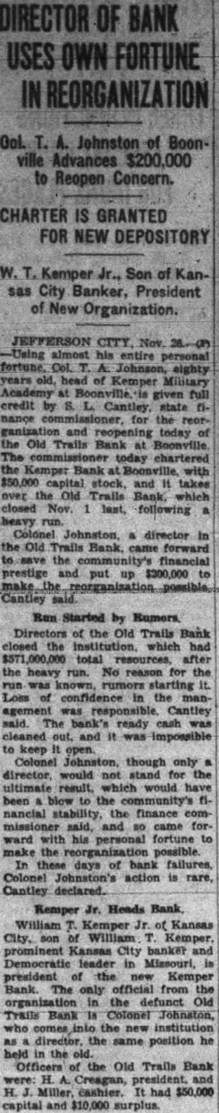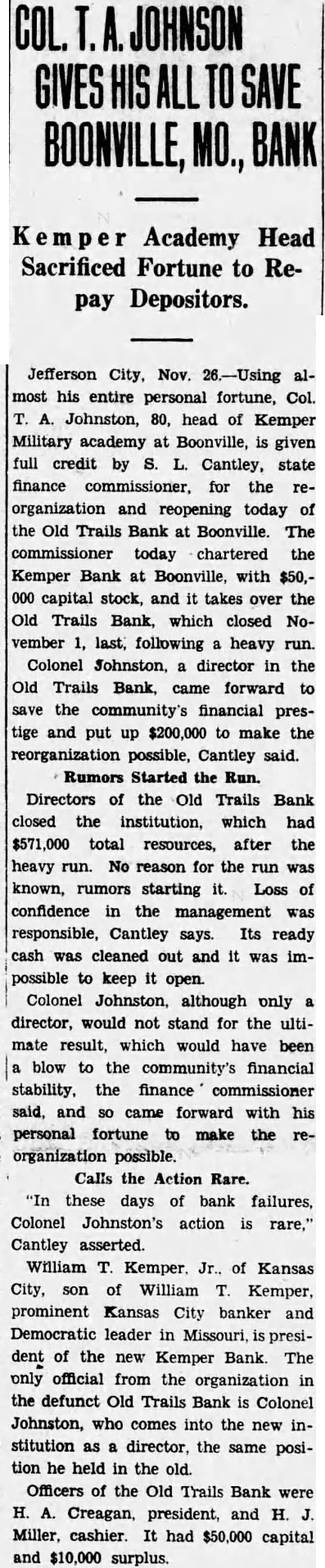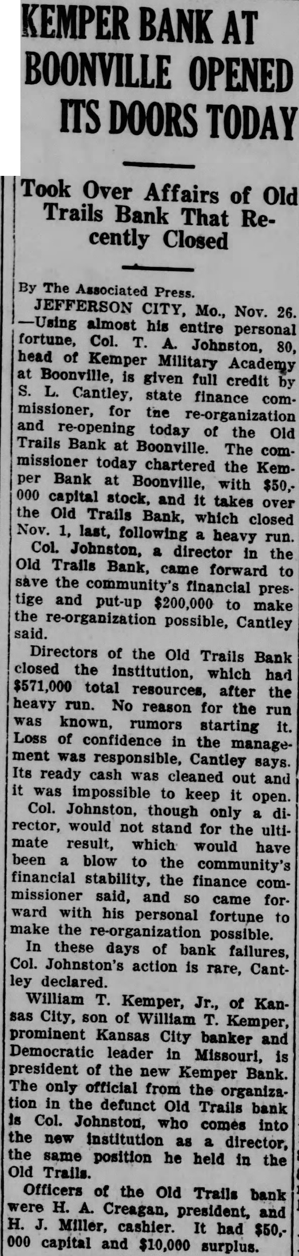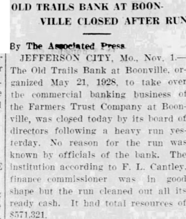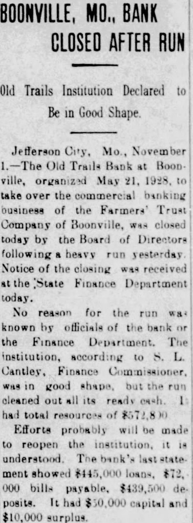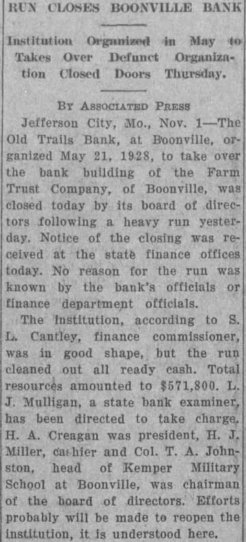 RUN CLOSES BOONVILLE BANK Institution Organized in May to Takes Over Defunct Organization Closed Doors Thursday. By ASSOCIATED PRESS Jefferson City, Mo., Nov. 1-The Old Trails Bank, at Boonville, organized May 21, 1928, to take over the bank building of the Farm Trust Company, of Boonville, was closed today by its board of directors following a heavy run yesterday. Notice of the closing was received at the state finance offices today. No reason for the run was known by the bank's officials or finance department officials. The Institution, according to S. L. Cantley, finance commissioner, was in good shape, but the run cleaned out all ready cash. Total resources amounted to $571,800. L. J Mulligan, a state bank examiner, has been directed to take charge. H. A. Creagan was president, H. J. Miller, cashier and Col. T. A Johnston, head of Kemper Military School at Boonville, was chairman of the board of directors. Efforts probably will be made to reopen the institution, it is understood here.