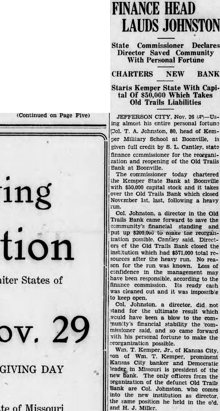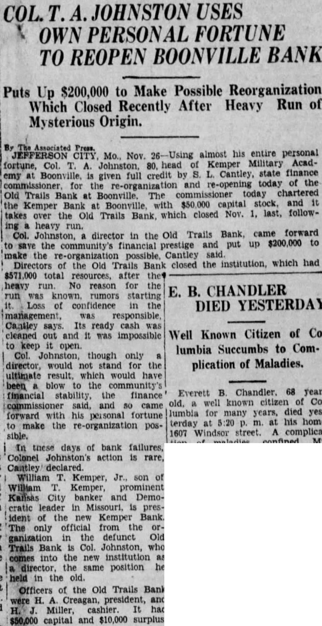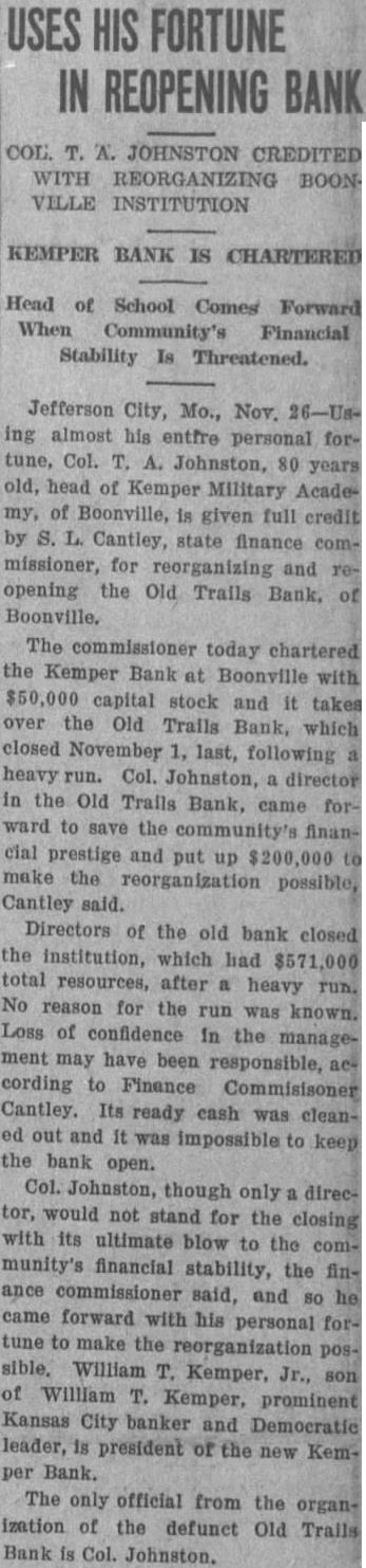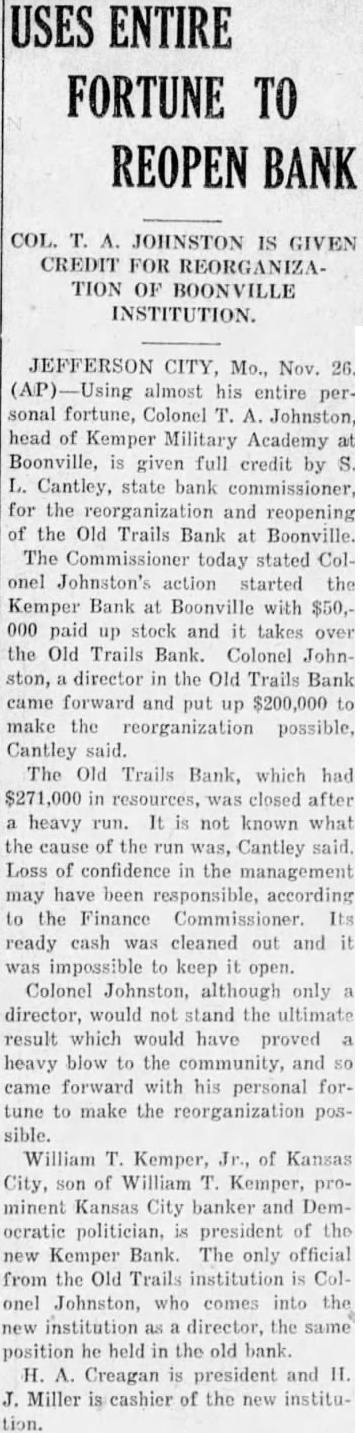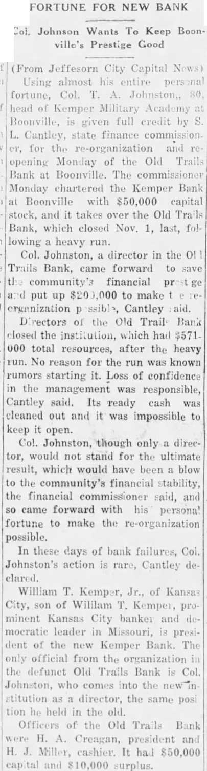 RUN CLOSES BOONVILLE BANK Institution Organized in May to Takes Over Defunct Organization Closed Doors Thursday. By ASSOCIATED PRESS Jefferson City, Mo., Nov. 1-The Old Trails Bank, at Boonville, organized May 21, 1928, to take over the bank building of the Farm Trust Company, of Boonville, was closed today by its board of directors following a heavy run yesterday. Notice of the closing was received at the state finance offices today. No reason for the run was known by the bank's officials or finance department officials. The Institution, according to S. L. Cantley, finance commissioner, was in good shape, but the run cleaned out all ready cash. Total resources amounted to $571,800. L. J Mulligan, a state bank examiner, has been directed to take charge. H. A. Creagan was president, H. J. Miller, cashier and Col. T. A Johnston, head of Kemper Military School at Boonville, was chairman of the board of directors. Efforts probably will be made to reopen the institution, it is understood here.