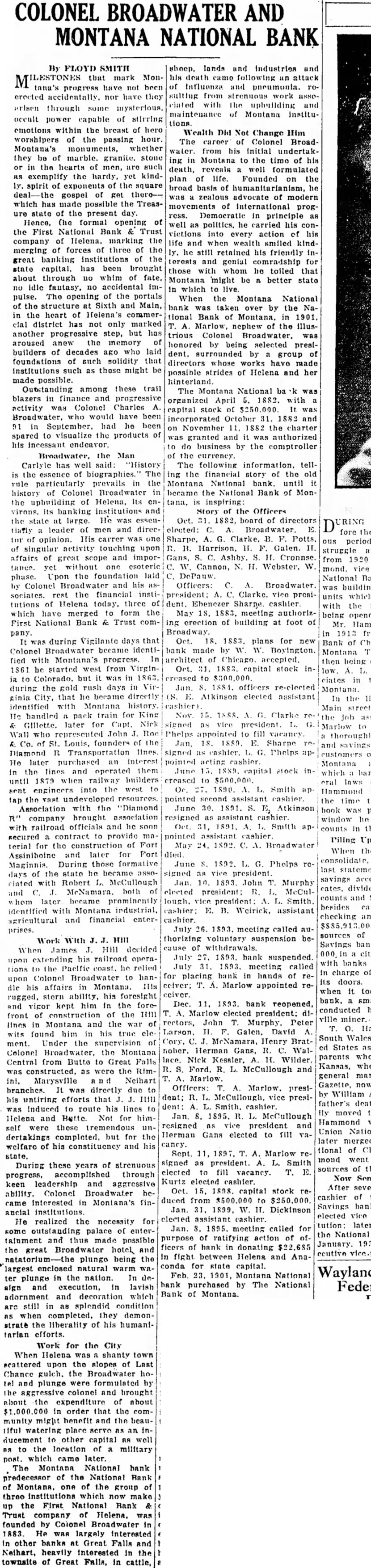 FLOYD lands and industries and that mark Mon- his death camo following attack have not been of Influenza and pneumonia. progress nor have they sulting from work clated with and through some maintenance of Montana occult power capable of tions. emotions within the breast of hero Wealth Did Not Change Him worshipers of the passing hour. The caroer of Colonel BroadMontana's monuments, whether water. from his Initial undertakthey be of marble. granite. stone in Montana to the time of his or the hearts of men, are such death, reveals well formulated exemplify the hardy. yet kindplan of life. Founded on the exponents of the square broad basis of humanitarianism, he gospel zealous advocate of modern which made possible the movements of International progstate of the present day. ress. Democratic principle Hence, formal opening well politics. he carried his the First National Bank Trust victions into every action of his company of Helena. marking the life wealth and when smiled kindmerging forces of three of the he still retained his friendly ingreat banking institutions of the terests and genial comradship for state capital. has been brought those with whom he tolled that about through whim fate, Montana might be better state idle fantasy, no accidental in which live pulse. The opening of the portals When the Montana National of the structure at Sixth and Main, bank was taken over by the the heart of Helena's commertional Bank of Montana, in 1901, district has not only marked Marlow, nephew of the Illusanother progressive step, but has trious Colonel Broadwater, aroused anew the memory of honored by being selected presibuilders of decades ago who laid dent. surrounded by group of foundations of such solidity that directors whose works have made institutions such as these might be possible strides of Helena and her made possible. hinterland. Outstanding among these trail The Montana National blazers finance and progressive 1882. organized April activity was Colonel Charles capital stock of would have been incorporated October and September. had he been on November 1882 the charter spared to visualize the products of granted and authorized his incessant endeavor. do business by the comptroller the Man of the currency. Carlyle has well said: "History The following information. tellthe essence of The ing the financial story of the old particularly prevails the Montana National bank. until history of Colonel Broadwater in became the National Bank of the upbuilding of Helena, its inspiring: virons. its banking and Story of Officers the state at large. He Oct. 1882, board of directors leader men and elected: Broadwater. opinion. Ilis carrer one Sharpe, Clarke. Potts. of singular activity touching upon affairs of great scope and Gans, Ashby. Cronnse. tance. one esoteric Cannon, Webster. phase. Upon the foundation laid DePauw. Colonel Broadwater and his Officers: Broadwater. sociates. financial president: Clarke. vice tutions of Helena today. three dent. Ebenezer Sharpe. cashier which have merged to form the May 1883. meeting authorizFirst National Bank Trust erection of building at foot Broadway. pany during Vigilante that Oct. 18. 1883. plans for Colonel Broadwater became bank made by Boyington. fied Montana's progress In architect of Chicago. accepted. 1861 started west from Virgin- Oct. 1883. capital stock Colorado. but during the gold rush days Jan. officers re-elected City, that he became Atkinson elected assistant identified Montana history handled pack train for Nov. Clarke later Capt. Nick signed president. L. Wall represented John appointed to fill vacancy. of Louis, founders of the Jan. Sharpe Diamond lines. later purchased interest pointed acting cashier. the lines and operated them capital stock 1879 when railway builders until engineers west Smith the undeveloped resources. pointed second assistant cashier. Association with the "Diamond June 30. Atkinson brought association resigned assistant cashier company railroad officials and Smith secured contract to provide assistant terial for the construction of Fort May Assiniboine and later for Fort died. Maginnis. During those June days state he became signed president. clated with Robert McCullough Jan. 1893. John Murphy and McNamara. both elected president: McCullater became prominently lough. vice president: identified with Montana industrial. assistant agricultural and financial cashier. prises. July meeting called