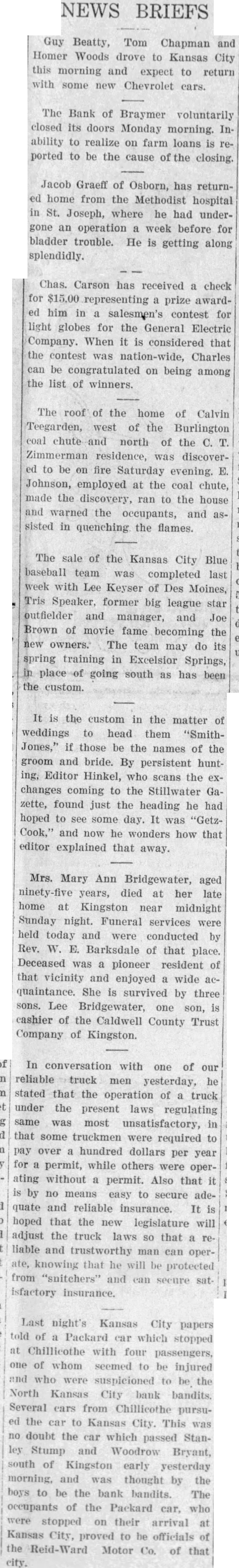 Last night's Kansas City papers told of a Packard car which stopped at Chillicothe with four passengers, one of whom seemed to be injured and who were suspicioned to be the North Kansas City bank bandits. Several cars from Chillicothe pursued the car to Kansas City. This was no doubt the car which passed Stanley Stump and Woodrow Bryant, south of Kingston early yesterday morning, and was thought by the boys to be the bank bandits. The occupants of the Packard car, who were stopped on their arrival at Kansas City, proved to be officials of the Reid-Ward Motor Co. of that city.