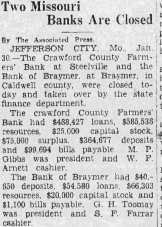 The Bank of Braymer voluntarily closed its doors Monday morning. Inability to realize on farm loans is reported to be the cause of the closing.