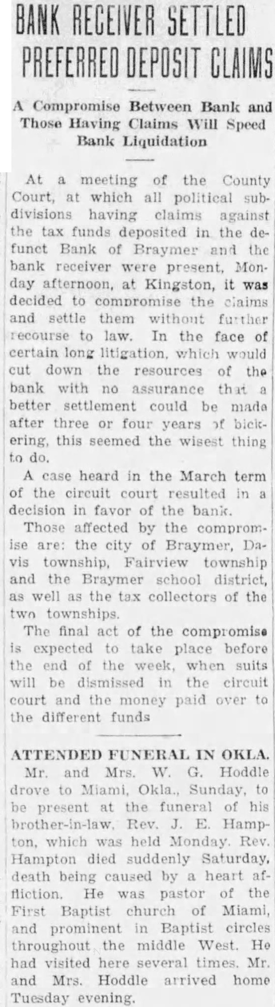 Compromise Between Bank Those Having Claims Will Speed Bank Liquidation At meeting of the County Court, which all political divisions having claims against the tax funds deposited in the funct Bank Braymer and bank receiver were present, Monday afternoon, Kingston, decided to the and settle them law. In the face certain long which would down the resources the bank no settlement could be made three four years this seemed the wisest heard in the March term the circuit court resulted decision in favor of the Those affected the compromthe city of Braymer, Datownship and the school district, well the collectors the townships The final act of the compromise expected take place before the end week, when suits in the circuit court the paid different funds ATTENDED FUNERAL IN Mr. Hoddle to Miami, Okla. Sunday, present the funeral his Rev. Hampwhich held Monday Rev Hampton died suddenly Saturday, death being caused by heart fliction. He pastor the Baptist church of Miami, prominent Baptist circles throughout the middle West. He had visited here several Mr. and Mrs. Hoddle arrived home Tuesday evening.