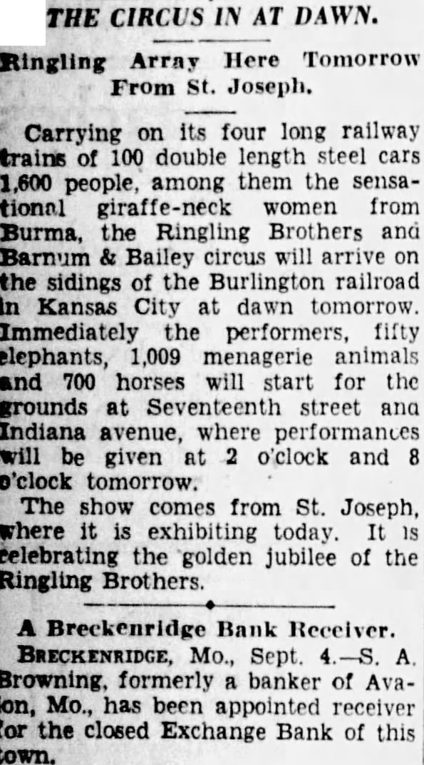 THE CIRCUS IN AT DAWN. Ringling Array Here Tomorrow From St. Joseph. Carrying on its four long railway trains of 100 double length steel cars 1,600 people, among them the sensational giraffe-neck women from Burma, the Ringling Brothers and Barnum & Bailey circus will arrive on the sidings of the Burlington railroad in Kansas City at dawn tomorrow Immediately the performers, fifty elephants, 1,009 menagerie animals and 700 horses will start for the grounds at Seventeenth street and Indiana avenue, where performances will be given at 2 o'clock and 8 tomorrow. The show comes from St. Joseph, where it is exhibiting today. celebrating the golden jubilee of the Ringling Brothers. A Breckenridge Bank Receiver. BRECKENRIDGE, Mo., Sept. 4.-S. A. Browning. formerly banker of AvaIon, Mo., has been appointed receiver for the closed Exchange Bank of this town.