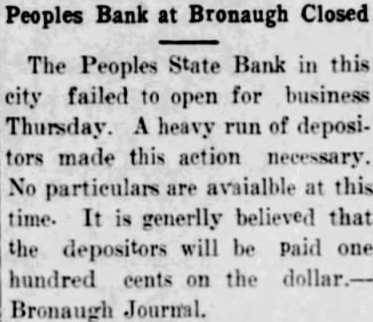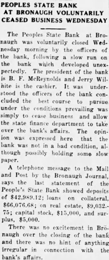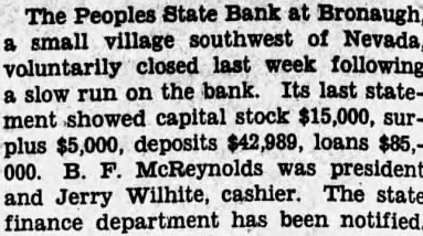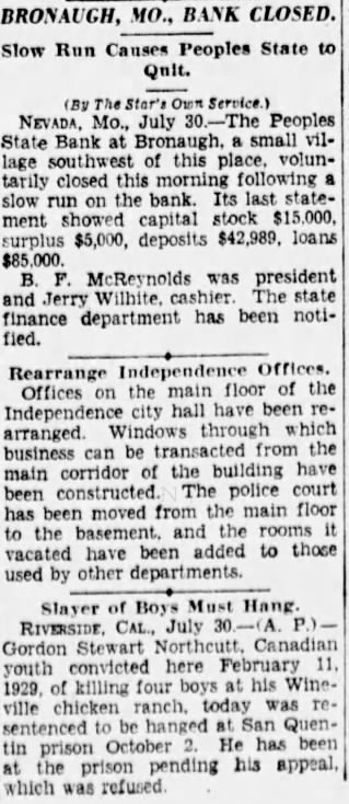 MO., BANK CLOSED. Slow Run Causes Peoples State to Quit. Service) NEVADA. Mo., July Peoples State Bank at Bronaugh, small village southwest of this place. voluntarily closed this morning following slow run the bank. Its last statement showed capital stock surplus $5,000, deposits $42,989. loans McReynolds was president and Jerry Wilhite. state finance department has been notified. Rearrange Independence Offices. main floor of the Offices the Independence city hall have arranged. which business can be transacted from the main corridor the building have been constructed. The police court has been moved from the main floor to the basement. and rooms vacated have been added to those used by other departments. Slayer of Boys Must Hang. RIVERSIDE. CAL., July Gordon Stewart Northcutt. Canadian youth convicted here February 1929, killing four his Wine ville chicken ranch. today was sentenced hanged at October He has tin prison the prison pending his which was refused