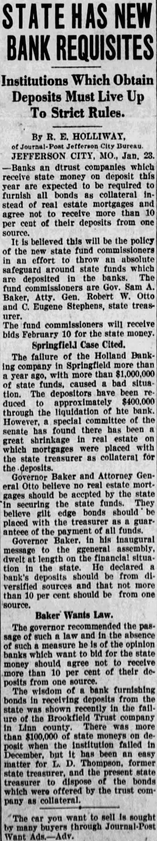 REQUISITES Institutions Deposits To Strict JEFFERSON CITY, MO., Jan. an dtrust companies which receive state money on deposit this year expected to be required furnish bonds collateral stead of real estate mortgages and not to receive more than agree of their deposits from one per cent believed this will be the policy the state fund effort throw an absolute an safeguard around state funds which the banks. The deposited fund commissioners are Gov. Sam Baker, Robert W. Otto Atty. and Eugene Stephens, state urer. The fund commissioners will receive bids February 10 for the money. Springfield Case Cited. The failure of the Holland Bankin Springfield more than ing company with more than caused bad situastate tion. The depositors have been $400,000 duced the liquidation of hte bank. through of However, special found there has been senate in real estate great shrinkage which mortgages were placed collateral for the state treasurer the deposits. Baker and Attorney GenGovernor eral Otto believe no real estate should be accpted by the state gages the state funds. They securing believe gilt edge bonds should placed with the guaranteee of the payment funds. Governor in his the assembly. message dwelt length the financial situaon the state. He declared tion bank's should be from deposits versified sources and that not more than cent should be from one per source. Baker Wants Law. The the pasin the absence sage he the opinion such measure banks which want to bid for the state should agree not receive money than cent of their more posits from one source. The wisdom of bank furnishing bonds deposits from the shown recently the state of the Brookfield Trust company Linn county. There was more than of state moneys when the Institution failed but has been an easy December, for Thompson, former and the present state to dispose the bonds treasurer which offered by the trust pany collateral. want to sell sought car you buyers through