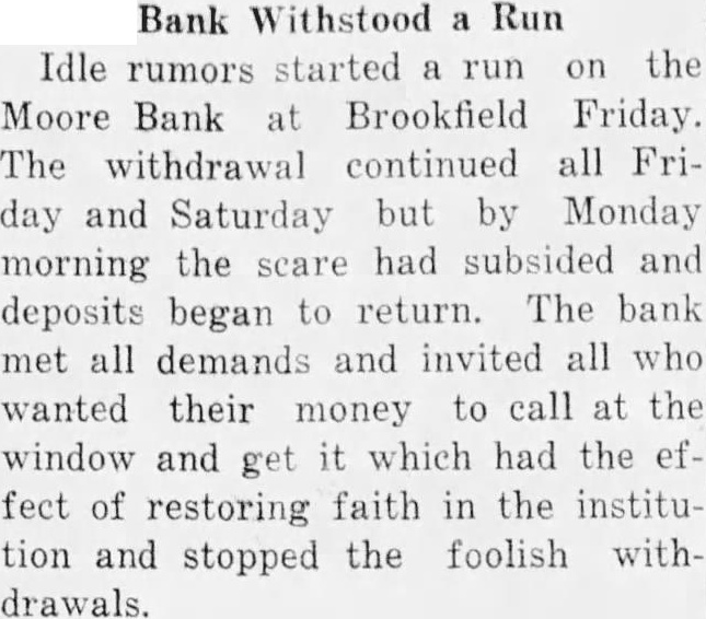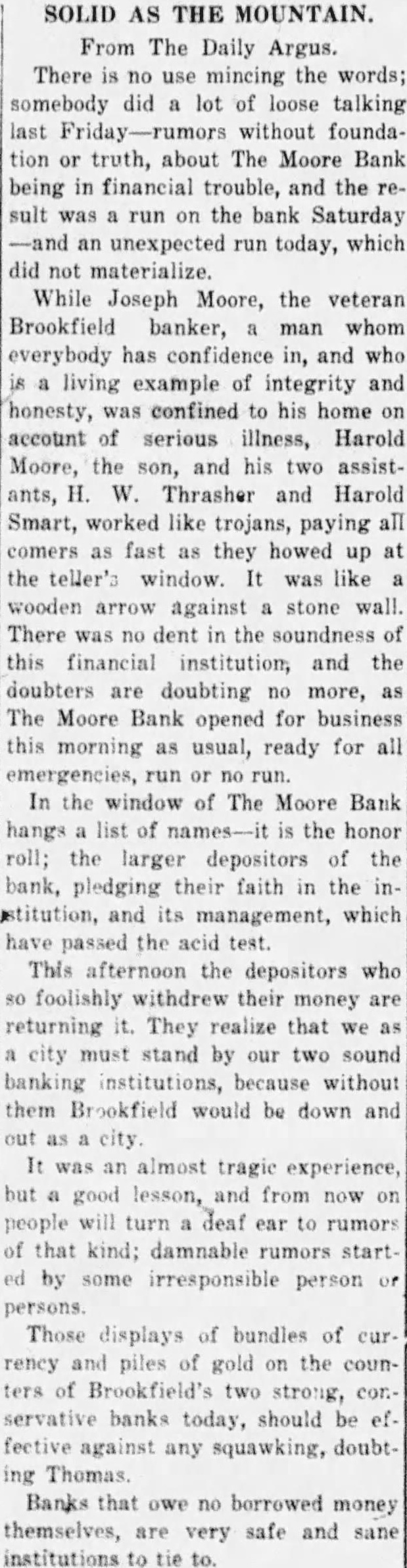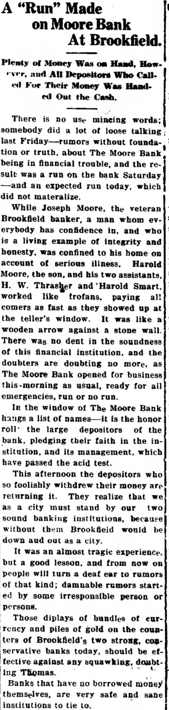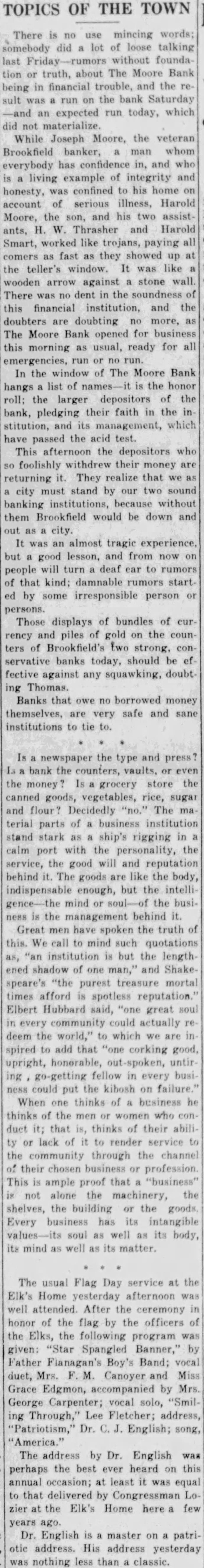 TOPICS OF THE TOWN There no use mincing somebody did lot of loose talking without foundation or truth, about The Moore Bank being in financial trouble, and the sult was run on the bank Saturday expected run today, which did not materialize. Joseph Moore, the veteran Brookfield banker, man whom everybody has confidence in, and who living example of integrity and honesty, was confined to his home on account of serious illness, Harold Moore, the son, and his two assistants, Thrasher and Harold Smart, worked like trojans, all comers as fast they showed up the teller's window. It was like wooden arrow against stone wall. There was dent in the soundness of this financial institution, and the doubters are doubting no more, The Moore Bank opened for business this morning usual, ready for all emergencies, run run. In the window of The Moore Bank hangs list of is the honor roll; the larger depositors the bank, pledging their faith in the in stitution, and its management, which have passed the acid test. This afternoon the depositors who foolishly withdrew their money are returning They realize that city must stand by our two sound banking institutions, because without them Brookfield would be down and city. It was an almost tragic experience, but good lesson, and from now people will turn deaf ear to rumors of that kind; damnable rumors started by some irresponsible person persons. Those displays of bundles of rency and piles of gold on the ters of Brookfield's two strong, conservative banks today, should be fective against any squawking, doubting Banks that owe no borrowed money themselves, very safe and sane institutions to to. newspaper the and bank the counters, vaults, the grocery store the canned goods, vegetables, rice, sugar and Decidedly The material parts of business institution stand stark ship's rigging in calm port with the personality, the service, the good will and reputation behind The goods are like the body, indispensable enough, but the intellimind the busithe management behind it. Great men have spoken the truth of this. We call to mind such quotations "an institution but the length. ened shadow of one man," and Shakespeare's purest treasure mortal times afford is spotless reputation." Elbert Hubbard said, "one great soul every community could actually deem the world," which spired to add that corking good, upright, honorable, untirfellow in every busicould the kibosh on failure." When one thinks of business thinks of the men women who duct that thinks of their abililack of to render service the community through the channel of their chosen business profession. This ample proof that not alone machinery, the shelves, the building the goods. Every business has its intangible soul well its body, mind well its matter. The usual Flag Day service the Elk's Home yesterday afternoon well attended. After the ceremony honor of the flag by the officers the Elks, the following program given: "Star Spangled Banner," Father Flanagan's Boy's Band; vocal duet, Mrs. Canoyer Miss Grace Edgmon, accompanied by Mrs. George Carpenter; vocal solo, Through," Lee Fletcher; address, "Patriotism," Dr. English; song, "America." The address by Dr. English perhaps the best ever heard this annual occasion; least was equal that delivered by Congressman zier the Elk's Home few years ago. Dr. English is master on patriaddress. His address yesterday nothing less than classic.