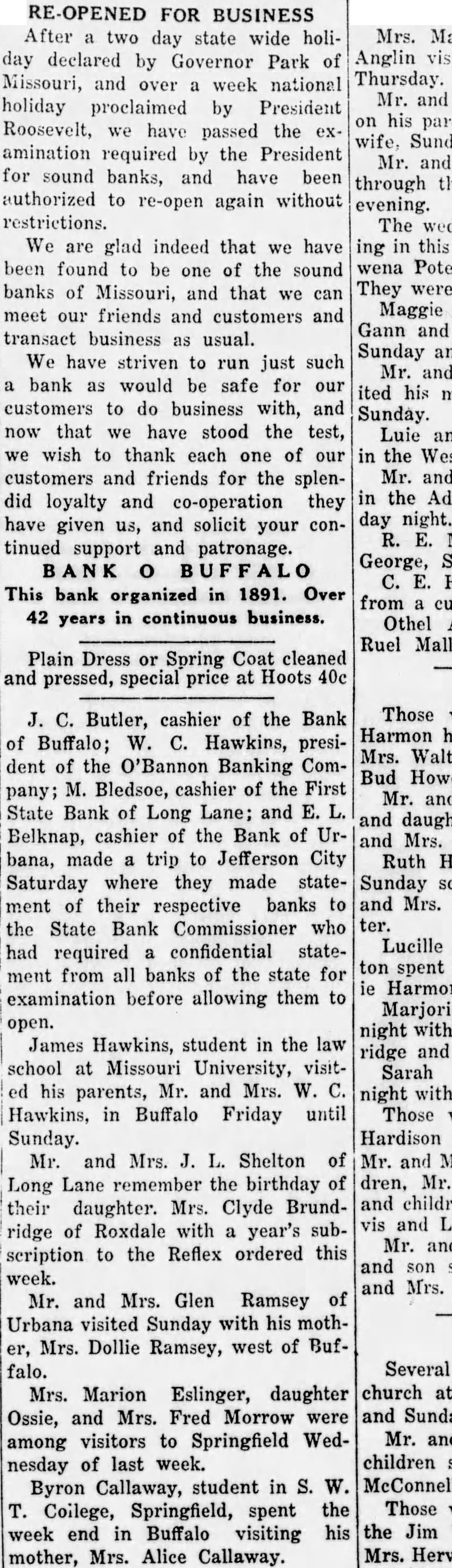 RE-OPENED FOR BUSINESS After a two day state wide holiday declared by Governor Park of Missouri, and over a week national holiday proclaimed by President Roosevelt, we have passed the examination required by the President for sound banks, and have been authorized to re-open again without restrictions. We are glad indeed that we have been found to be one of the sound banks of Missouri, and that we can meet our friends and customers and transact business as usual. We have striven to run just such a bank as would be safe for our customers to do business with, and now that we have stood the test, we wish to thank each one of our customers and friends for the splendid loyalty and co-operation they have given us, and solicit your continued support and patronage. BANK o BUFFALO This bank organized in 1891. Over 42 years in continuous business. Plain Dress or Spring Coat cleaned and pressed, special price at Hoots 40c J. C. Butler, cashier of the Bank of Buffalo; W. C. Hawkins, president of the O'Bannon Banking Company; M. Bledsoe, cashier of the First State Bank of Long Lane; and E. L. Belknap, cashier of the Bank of Urbana, made a trip to Jefferson City Saturday where they made statement of their respective banks to the State Bank Commissioner who ter. had required a confidential statement from all banks of the state for ie Harmon. examination before allowing them to open. James Hawkins, student in the law ridge and school at Missouri University, visited his parents, Mr. and Mrs. W. C. Hawkins, in Buffalo Friday until Sunday. Mr. and Mrs. J. L. Shelton of Long Lane remember the birthday of their daughter. Mrs. Clyde Brundridge of Roxdale with a year's subscription to the Reflex ordered this week. Mr. and Mrs. Glen Ramsey of Urbana visited Sunday with his mother, Mrs. Dollie Ramsey, west of Buffalo. Mrs. Marion Eslinger, daughter Ossie, and Mrs. Fred Morrow were among visitors to Springfield Wednesday of last week. Byron Callaway, student in S. W. T. Coilege, Springfield, spent the week end in Buffalo visiting his mother, Mrs. Alice Callaway.