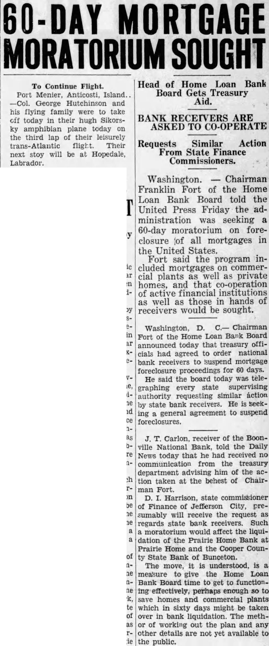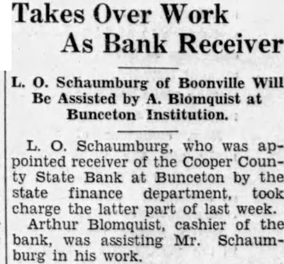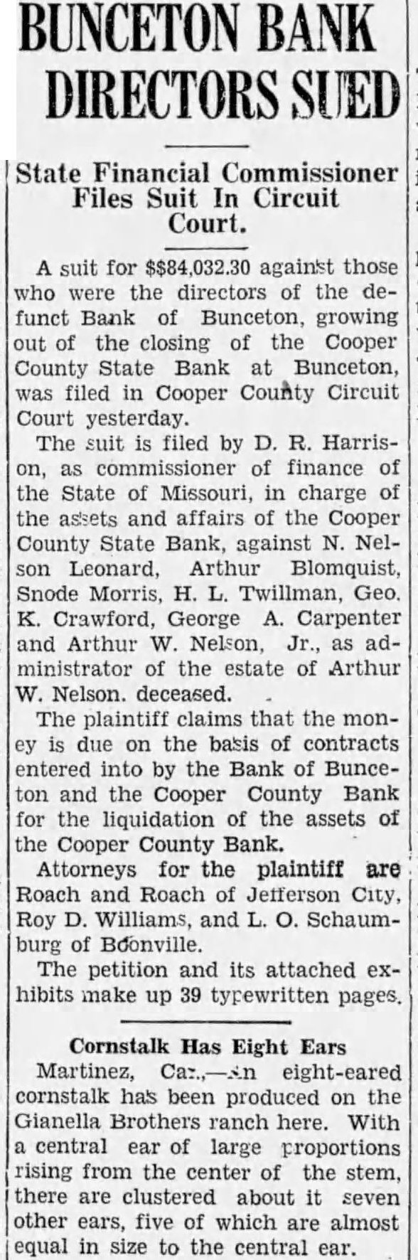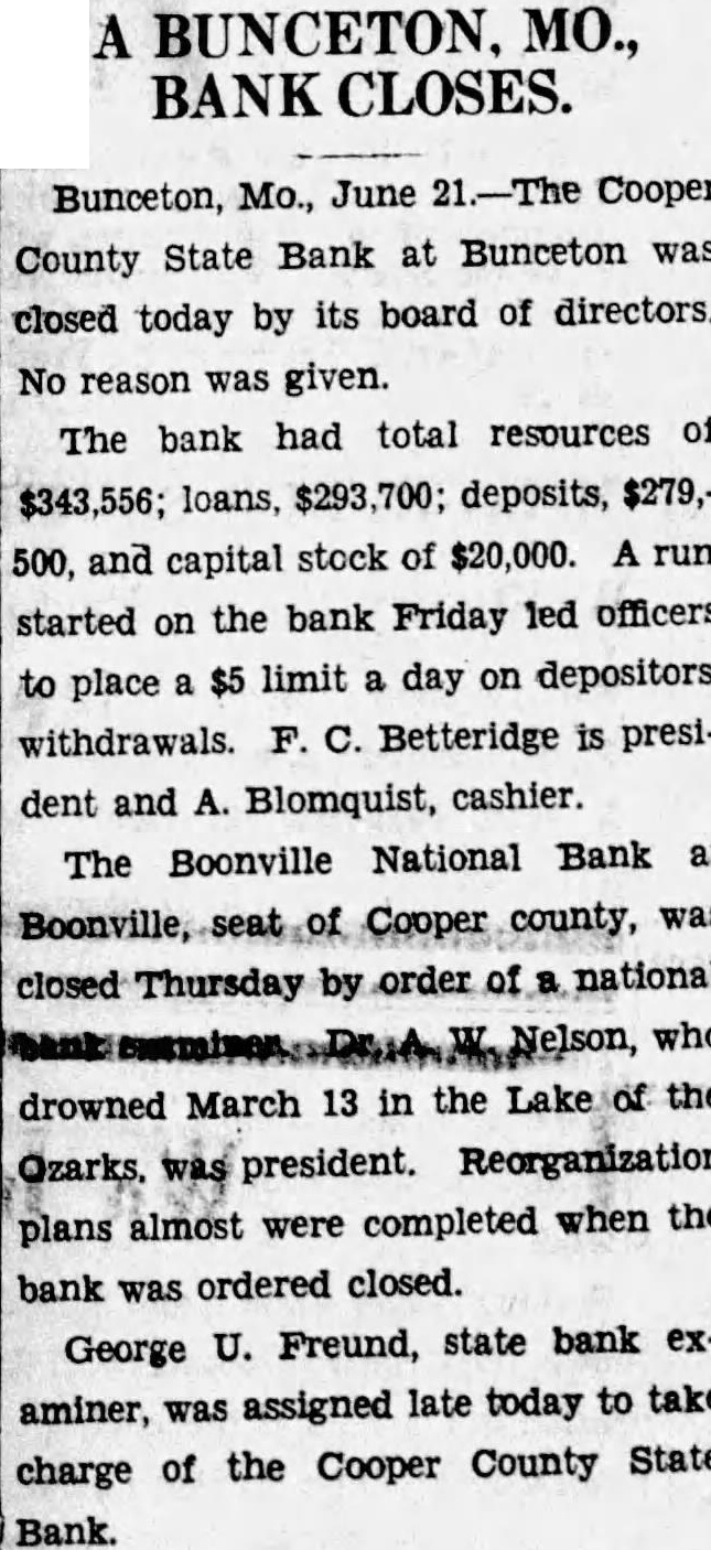 A BUNCETON, MO., BANK CLOSES. Bunceton, Mo., June 21.-The Cooper County State Bank at Bunceton was closed today by its board of directors. No reason was given. The bank had total resources of $343,556; loans, $293,700; deposits, $279,- 500, and capital stock of $20,000. A run started on the bank Friday led officers to place a $5 limit a day on depositors' withdrawals. F. C. Betteridge is presi- dent and A. Blomquist, cashier. The Boonville National Bank at Boonville, seat of Cooper county, was closed Thursday by order of a national who Nelson, drowned March 13 in the Lake of the Ozarks, was president. Reorganization plans almost were completed when the bank was ordered closed. George U. Freund, state bank examiner, was assigned late today to take charge of the Cooper County State Bank.