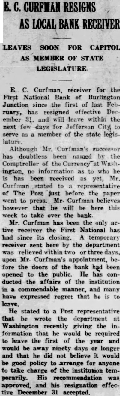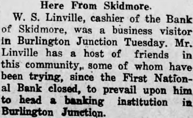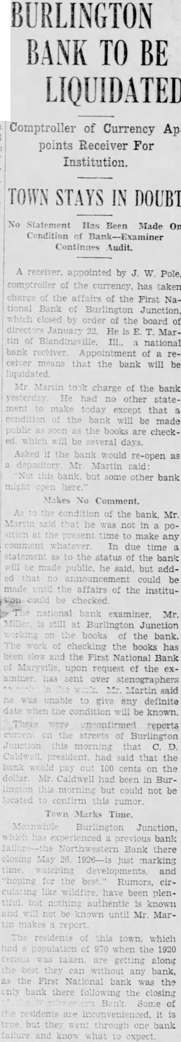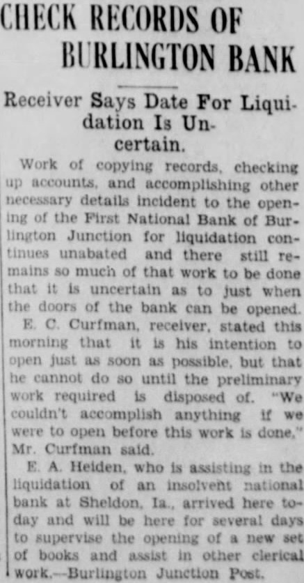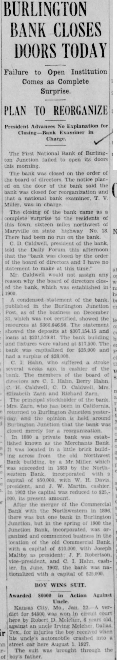 BURLINGTON BANK CLOSES DOORS Failure to Institution Open Comes as Complete Surprise. REORGANIZE President Advances No Explanation Examiner Charge. The First National Bank of Burlington Junction failed to open its doors morning. The bank was closed the order the board directors. The notice the door of the bank said the bank was closed for and that national bank examiner, Miller, charge. The closing of the bank came complete surprise to the residents this town sixteen miles northwest Maryville state highway No. There had been no run on the bank. Caldwell, president the bank told the Daily Forum this afternoon that the "bank was closed by the order the board directors and have to make Mr. Caldwell would not assign any the board of directors the bank, which established 1900. condensed statement the bank. published in the Burlington Junction Post, the business on December which was showed the resources The statement showed deposits and The bank building and valued bank capitalized for $25,000 and surplus Hahn. who suffered weeks cashier of the The members the board Elizabeth Zarn Richard Zarn The principal stockholder the bank Zarn, who has been in California, returned and opinion held around Burlington Junetion that the bank closed merely for reorganization In private bank was established known Merchants Bank located in little brick buildacross from the Northwest Bank building. by Miller which succeeded by the Northwestern incorporated capital with and Martin. cashier In 1902 the capital reduced its present amount After the merger the Commercial Bank with the Northwestern there but one bank Burlington Junction, but in the spring Junction Bank, incorporated was ganized and commenced business the location the old Commercial Bank with capital with Joseph Maltby president: and Hahn, cashIn June, 1902. the bank tionalized with capital of BOY WINS SUIT. Awarded $6000 in Action Against Uncle. Kansas City, Mo., Jan. diet for $4500 was won in circuit here by Robert Melcher, years old. against an uncle Irving Melcher Dallas, for injuries the boy received when his uncle's automobile crashed street car here August The suit brought through the father.