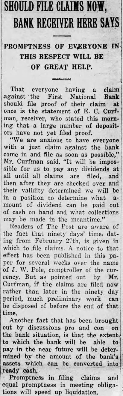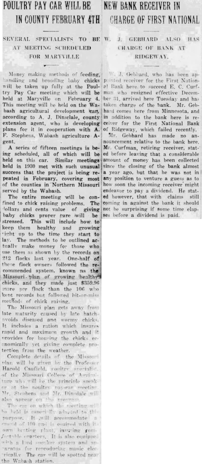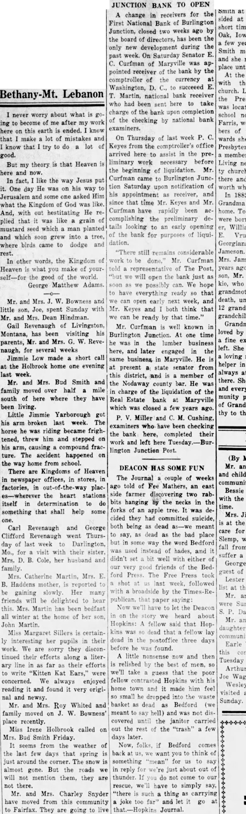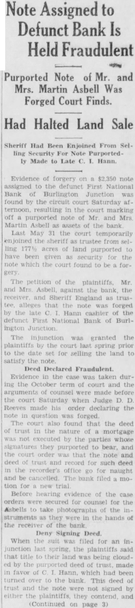 BURLINGTON BANK CLOSES DOORS Failure to Institution Open Comes as Complete Surprise. REORGANIZE President Advances No Explanation Examiner Charge. The First National Bank of Burlington Junction failed to open its doors morning. The bank was closed the order the board directors. The notice the door of the bank said the bank was closed for and that national bank examiner, Miller, charge. The closing of the bank came complete surprise to the residents this town sixteen miles northwest Maryville state highway No. There had been no run on the bank. Caldwell, president the bank told the Daily Forum this afternoon that the "bank was closed by the order the board directors and have to make Mr. Caldwell would not assign any the board of directors the bank, which established 1900. condensed statement the bank. published in the Burlington Junction Post, the business on December which was showed the resources The statement showed deposits and The bank building and valued bank capitalized for $25,000 and surplus Hahn. who suffered weeks cashier of the The members the board Elizabeth Zarn Richard Zarn The principal stockholder the bank Zarn, who has been in California, returned and opinion held around Burlington Junetion that the bank closed merely for reorganization In private bank was established known Merchants Bank located in little brick buildacross from the Northwest Bank building. by Miller which succeeded by the Northwestern incorporated capital with and Martin. cashier In 1902 the capital reduced its present amount After the merger the Commercial Bank with the Northwestern there but one bank Burlington Junction, but in the spring Junction Bank, incorporated was ganized and commenced business the location the old Commercial Bank with capital with Joseph Maltby president: and Hahn, cashIn June, 1902. the bank tionalized with capital of BOY WINS SUIT. Awarded $6000 in Action Against Uncle. Kansas City, Mo., Jan. diet for $4500 was won in circuit here by Robert Melcher, years old. against an uncle Irving Melcher Dallas, for injuries the boy received when his uncle's automobile crashed street car here August The suit brought through the father.