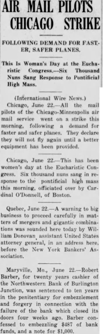 CHICAGO SAFER PLANES. This Woman's Day at the Eucharistic Thousand Nuns Sang Response to Pontificial High Mass. (International Wire News.) Chicago, the mail pilots of the air mail service went strike this morning, following demand for faster and safer planes. They declare they will not fly again until better equipment has been provided. Chicago, June has been women's day at the Eucharistic gress. Six thousand nuns in sponse to pontificial high this morning, officiated by Cardinal O'Donnell, of Boston. Quebec, warning business to proceed carefully in of mergers and gigantie combinations sounded here today by William Donovan assistant United States attorney general, in address here, before the New York Bankers' sociation. Maryville, Barber, for twenty cashier years the Northwestern Bank of Burlington Junction, was sentenced to ten years the penitentiary for embezzlement and forgery connection with the failure of the bank which closed its doors four weeks ago. Barber confessed to embezzling $487 of bank funds, and note for