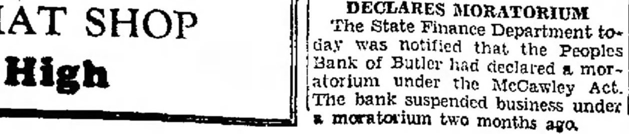 DECLARES MORATORIUM The State Finance Department today was notified that the Peoples Bank of Butler had declared a morHigh atorium under the McCawley Act. The bank suspended business under a moratorium two months ago,