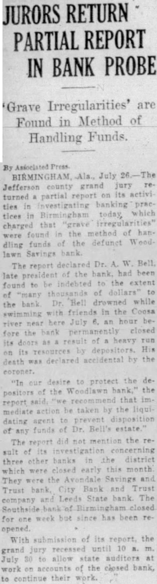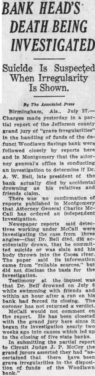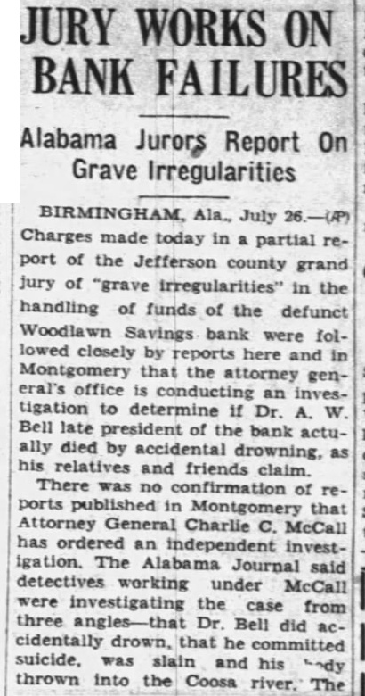 By The Associated Press Birmingham, Ala., July Charges made yesterday in a partial report of the Jefferson county grand jury of "grave irregularities" in the handling of funds of the defunct Woodlawn Savings bank were followed closely by reports here and in Montgomery that the attorney general's office is conducting an investigation to determine if Dr. A. W. Bell, late president of the bank actually died by accidental drowning as his relatives and friends claim. There was no confirmation of reports published in Montgomery that Attorney General Charles McCall has ordered an independent investigation. Newspaper reports said detectives working under McCall were investigating the case from three angles-that Dr. Bell died, did accidentally that he committed suicide or was slain and his body thrown into the Coosa river. The paper said its information came from "reliable sources,' but did not disclose the basis for the investigation. Testimony at the inquest was that Dr. Bell on July while swimming with friends and within an hour after run on his bank had forced its closing. The coroner has not returned verdict. McCall would not comment on the report. He has been closeted with the grand jury here since it began its investigation nearly two weeks ago into causes which led up to the closing of five state banks. In submitting the partial report to Circuit Judge J. P. McCoy the grand jurors asserted they had "ascertained that there have been grave irregularities in the disposition of funds of the Woodlawn bank.