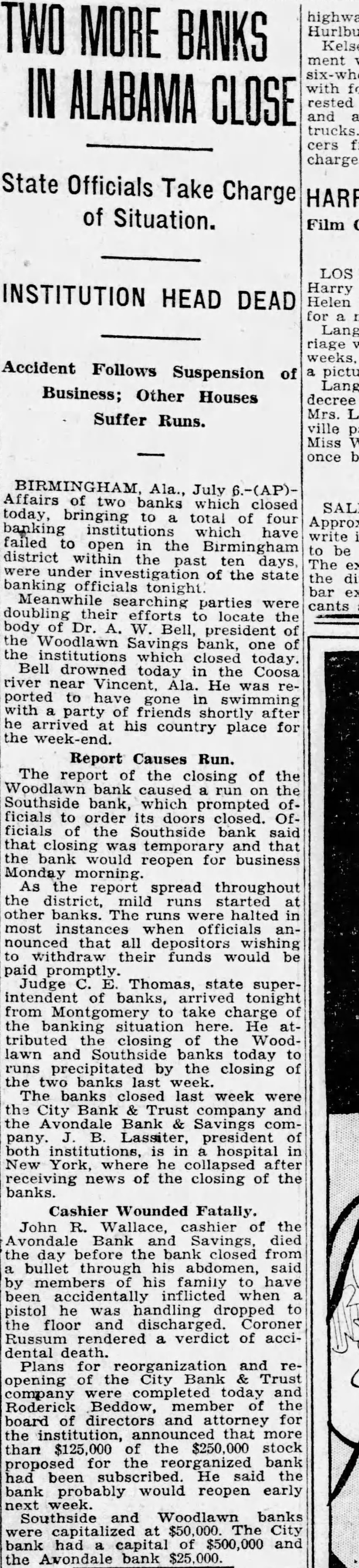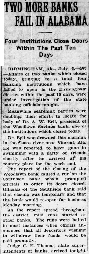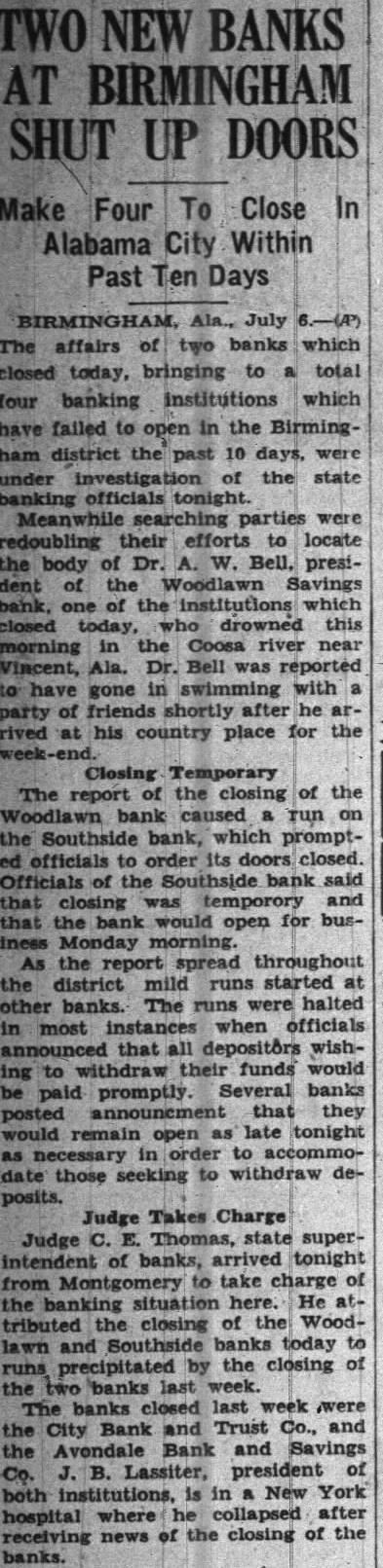 July banks which closed today, bringing total four banking which have failed open in the Birmingham district within past ten under investigation of banking officials tonight. Meanwhile searching parties were doubling their efforts locate body Bell, president the Woodlawn Savings bank, one the institutions which closed today. Dr. Bell drowned this mornthe Coosa river near VinAla., Dr. Bell was reported gone swimming with friends shortly after he rived his country for place week The report of the closing of Woodlawn bank caused on the Southside bank which prompted cials order its doors closed. Southside bank closing temporary and that bank would re-open business Monday morning Judge Thomas, state superintendent of banks, arrived night from Montgomery charge banking situation here. attributed the closing the Woodlawn Southside banks today runs precipitated the closing of the two banks last banks closed last bank and Trust the Avondale bank Savings president in New York hospital where he collapsed after receiving news of the closing the banks. John Wallace, cashier of the City bank and Trust company, died day before the bank closed from bullet through his abdosaid by members of his famhave been flicted when pistol he was ing dropped the floor and charged. Coroner Russum dered verdict of accidental