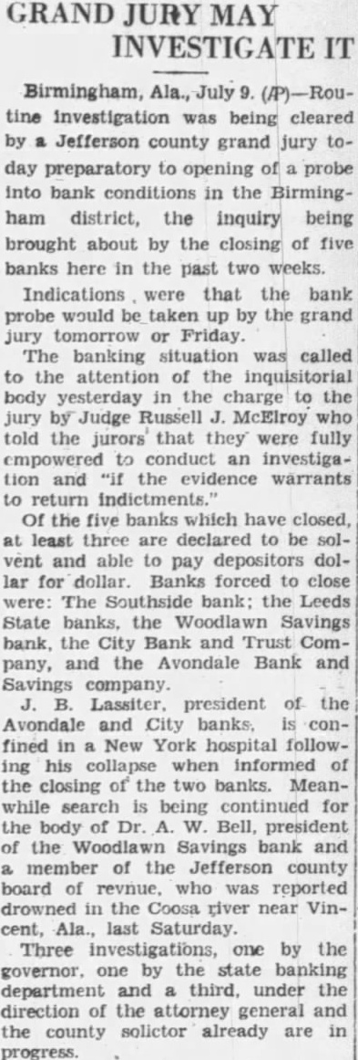 Birmingham, Ala., July 9. (A)-Routine investigation was being cleared by a Jefferson county grand jury today preparatory to opening of a probe into bank conditions in the Birmingham district, the inquiry being brought about by the closing of five banks here in the past two weeks. Indications were that the bank probe would be taken up by the grand jury tomorrow or Friday. The banking situation was called to the attention of the inquisitorial body yesterday in the charge to the jury by Judge Russell J. McElroy who told the jurors that they were fully empowered to conduct an investigation and "if the evidence warrants to return indictments.' Of the five banks which have closed, at least three are declared to be solvent and able to pay depositors dollar for dollar. Banks forced to close were: The Southside bank: the Leeds State banks, the Woodlawn Savings bank, the City Bank and Trust Company, and the Avondale Bank and Savings company. J. Lassiter, president of the Avondale and City banks, is confined in a New York hospital following his collapse when informed of the closing of the two banks. Meanwhile search is being continued for the body of Dr. A. W. Bell, president of the Woodlawn Savings bank and a member of the Jefferson county board of revnue, who was reported drowned in the Coosa river near Vincent, Ala., last Saturday. Three investigations, one by the governor, one by the state banking department and a third, under the direction of the attorney general and the county solictor already are in progress.