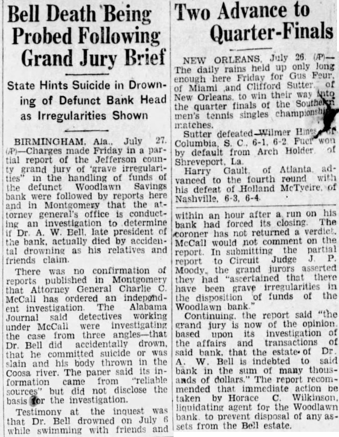 BIRMINGHAM. Ala., July 27. Friday in partial report of the Jefferson coungrand jury of 'grave irregularithe handling of funds the defunct Woodlawn Savings bank were followed by reports here in Montgomery that the torney general's office is conductan investigation to determine Dr. Bell late president the bank. actually died by accidendrowning as his relatives and friends claim There was no confirmation of reports published in Montgomery that Attorney General Charlie McCall has ordered an independinvestigation The Alabama ent Journal said detectives working under McCall were investigating case from three angles-that the Dr. Bell did accidentally drown, that he committed suicide or was slain and his body thrown in the Coosa The paper said its formation came from did not disclose the but basis the investigation. Testimony at the inquest was that Dr. Bell drowned on July swimming with friends and while for Gus Feur enough here Friday Clifford Sutter of of Miami and win their way New finals of the the quarter men's tennis singles matches. Sutter Columbia 6-2 by default from Arch Holder of Atlanta adHarry Gault vanced to the fourth round with his defeat of Holland McTyeire of 6-3, 6-4 within an hour after run on his forced closing The bank had coroner has not returned verdict McCall would not comment on submitting partial In to Circuit Judge report Moody. the grand jurors asserted they had "ascertained that there have been grave in the disposition of funds of the Woodlawn bank Continuing the report said "the grand jury is now of the opinion based upon its investigation the affairs and transactions of said bank. that the estate of Dr W. Bell indebted to said bank in the sum many thousands of dollars The report recommended that immediate action be taken by Horace Wilkinson liquidating agent for the Woodlawn bank to disposal of any assets from the Bell estate.