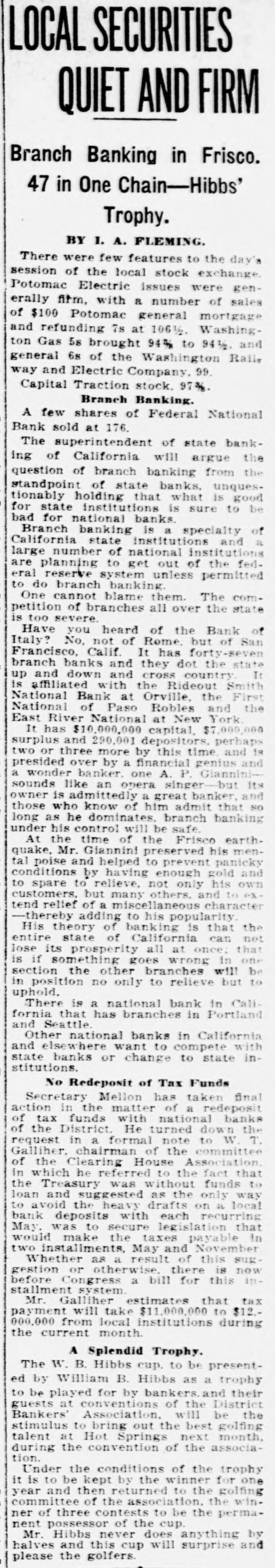 One of the very first State banks to take advantage of the passage of the McFadden Banking Act, authorizing admission into the national banking system of State banks operating branches, was the Bank of Italy located in San Fran cisco. Immediately upon enhetment of the new law that bank applied for and received national charter.