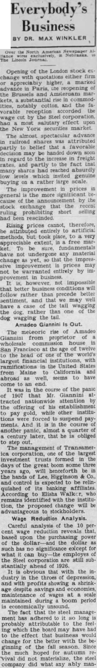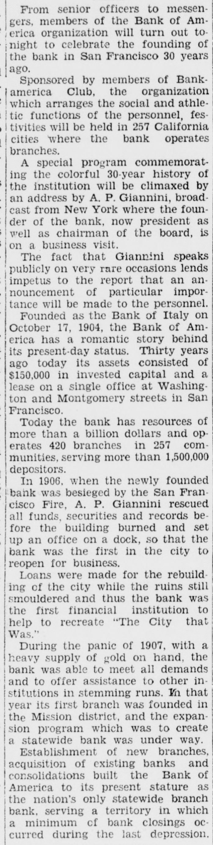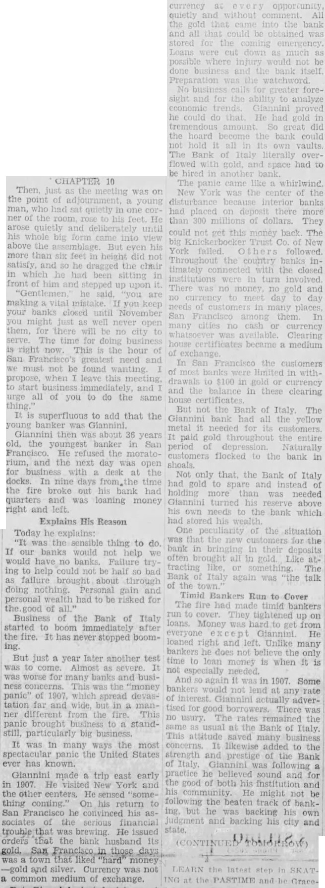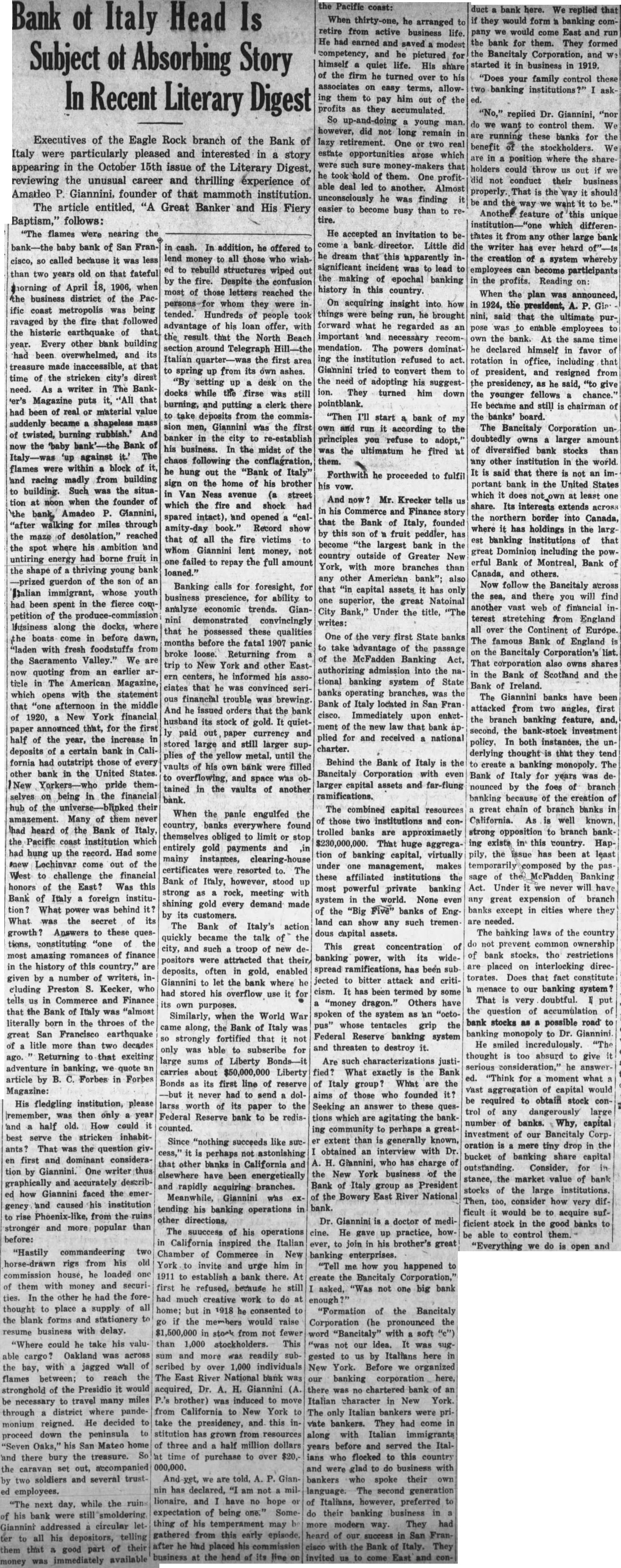 Executives of the Eagle Rock branch of the Bank of Italy were particularly pleased and interested in a story appearing in the October 15th issue of the Literary Digest, reviewing the unusual career and thrilling experience of Amatleo P. Giannini, founder of that mammoth institution. The article entitled, Great Banker and His Fiery Baptism," follows: flames were nearing the baby bank of San Francisco, so called because it was less than two years old on that fateful morning of April i8, 1906, when the business district of the Pacific coast metropolis was being ravaged by the fire that followed the historic earthquake of that year. Every other bank building had been overwhelmed, and its treasure made inaccessible, at that time of the stricken city's direst need. As writer in The Bank'er's Magazine puts it, that had been of real or material value suddenly became shapeless mass of twisted, burning rubbish.' And now the 'baby Bank of 'up against it.' The flames were within block of it, and racing madly from building to building. Such was the situation at noon when the founder of the bank, Amadeo P. "after walking for miles through the maze of desolation," reached the spot where his ambition and untiring energy had borne fruit in the shape of thriving young bank -prized guerdon of the son of an Isalian immigrant, whose youth had been spent in the fierce competition of the Business along the docks, where boats come in before dawn, "laden with fresh foodstuffs from the Sacramento Valley." We are now quoting from an earlier article in The American Magazine, which opens with the statement that "one afternoon in the middle of 1920, New York financial paper announced that, for the first half of the year, the increase in deposits of certain bank in California had outstript those of every other bank in the United States. New pride themselves on being in the financial hub of the their amazement. Many of them never had heard of the Bank of Italy, the Pacific coast institution which had hung up the record. Had some #new Lochinvar come out of the West to challenge the financial honors of the East? Was this Bank of Italy foreign institution? What power was behind it? What was the secret of its growth? Answers to these questions, constituting "one of the most amazing romances of finance in the history of this country," are given by number of writers, including Preston S. Kecker, who tells us in Commerce and Finance that the Bank of Italy was "almost literally born in the throes of the great San Francisco earthquake of litle more than two decades ago. Returning to that exciting adventure in banking, we quote an article by B. C. Forbes in Forbes Magazine: