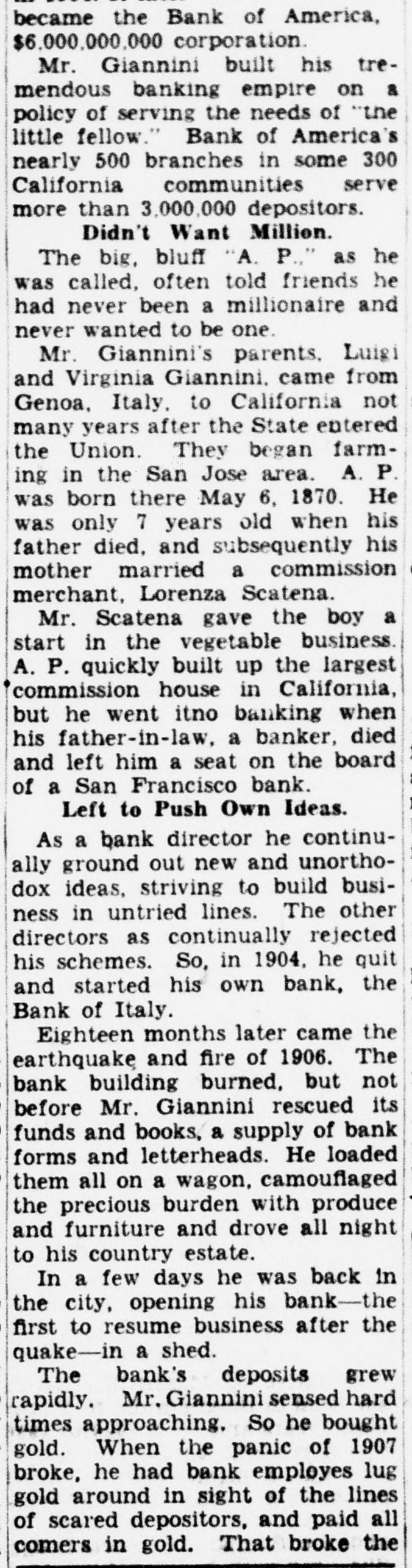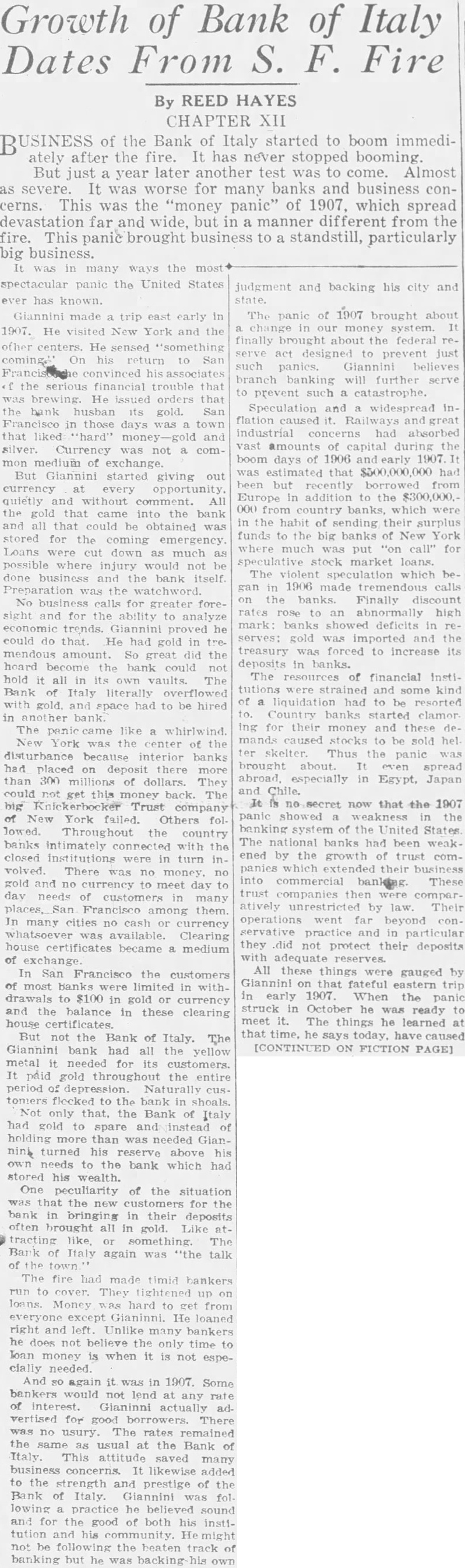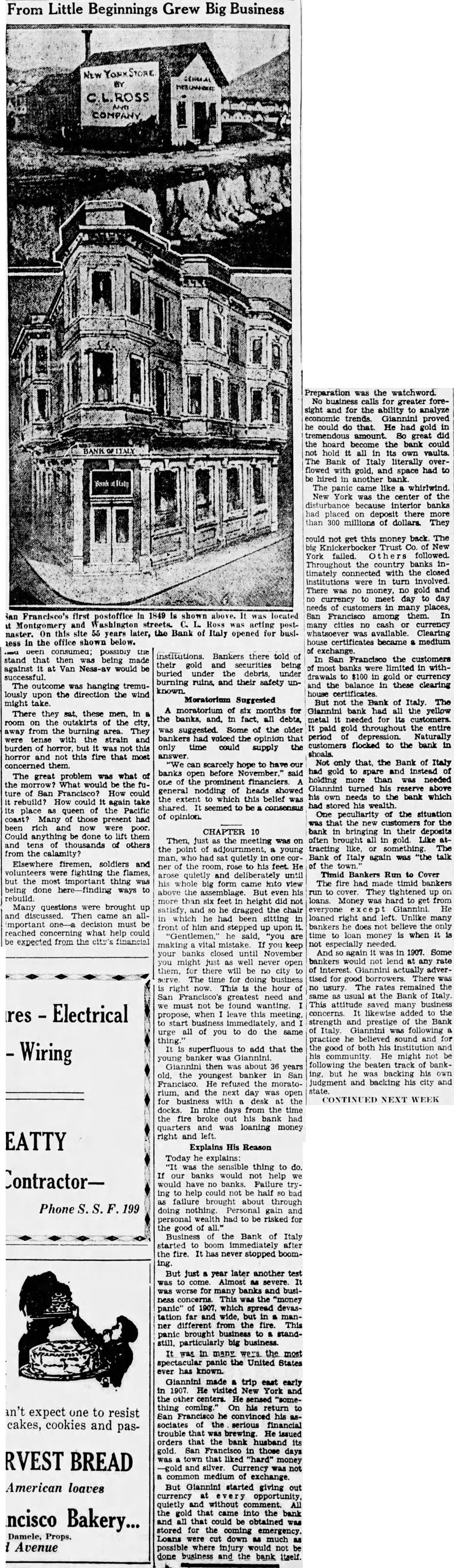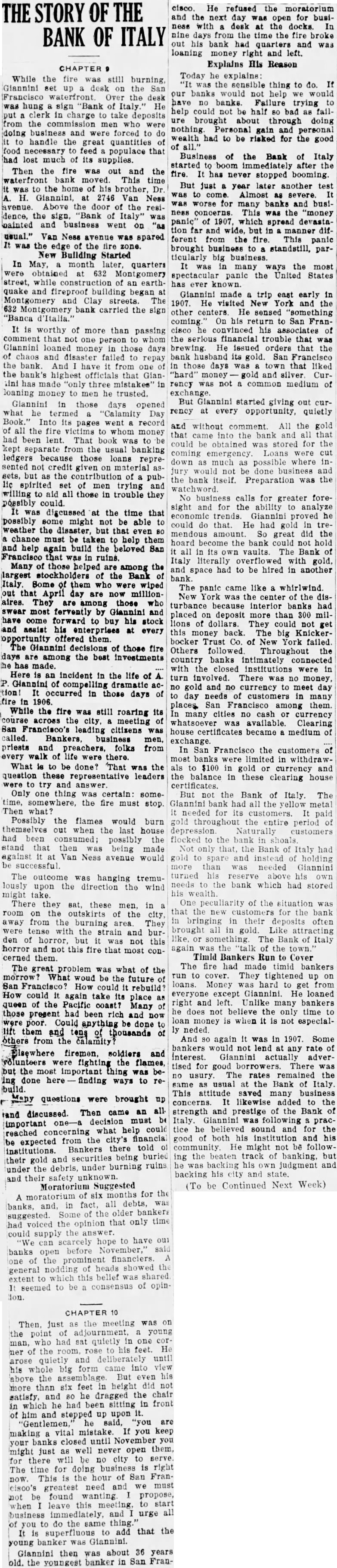"Hastily commandeering two horse-drawn rigs from his old commission house, he loaded one of them with money and securities. In the other he had the forethought to place supply of all the blank forms and stationery to resume business with delay. "Where could he take his valuable cargo? Oakland was across the bay, with jagged wall of reach the flames between; to stronghold of the Presidio it would be necessary to travel many miles through district where pandemonium reigned. He decided proceed down the peninsula to "Seven Oaks," his San Mateo home and there bury the treasure. So the caravan set out, accompanied by two soldiers and several trusted employees. next day, while the ruins of his bank were still smoldering Giannini addressed circular ter all his depositors, telling to of their them that good part immediately available money was in cash. In addition, he offered to lend money to all those who wished to rebuild structures wiped out by the fire. Despite the confusion most of those letters reached the whom they were intended. Hundreds of people took advantage of his loan offer, with the result that the North Beach section around Telegraph Italian the first area to spring up from its own ashes. "By setting up desk on the docks while the firse was still burning, and putting clerk there to take deposits from the commission men, Giannini was the first banker in the city to re-establish his business. In the midst of the chaos following the conflagration, he hung out the "Bank of Italy" sign on the home of his brother in Van Ness avenue (a street which the fire and shock had spared intact), and opened "calamity-day book." Record show that of all the fire victims to whom Giannini lent money, not one failed to repay the full amount loaned."