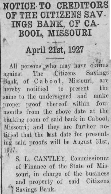 NOTICE TO CREDITORS OF THE CITIZENS SAVINGS BANK, OF CABOOL, MISSOURI April 21st, 1927 All persons who may have claims against The Citizens Savings Bank, of Missouri, are hereby notified to present the same to the undersigned and make proper proof thereof within four months from the above date at the banking room of said bank in Cabool, Missouri; and they are further notified that the last date for presenting said proofs will be August 31st, 1927. S. L. CANTLEY, Commissioner of Finance of the State of Missouri, in charge of the business and property of said Citizens Savings Bank.