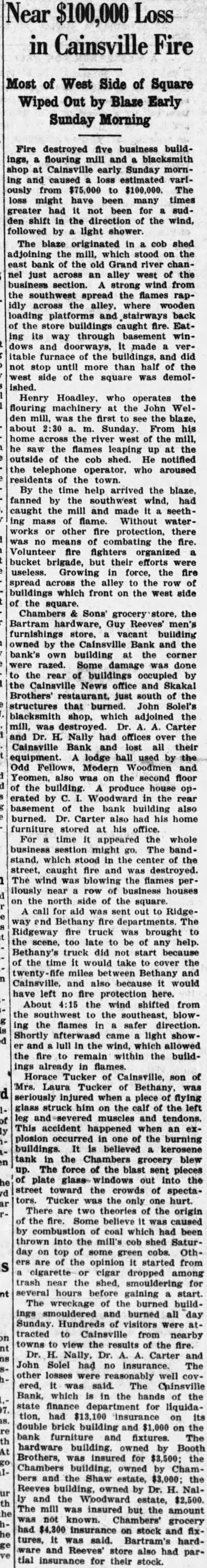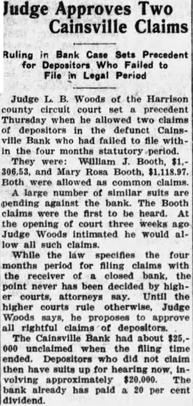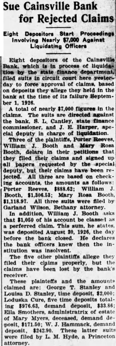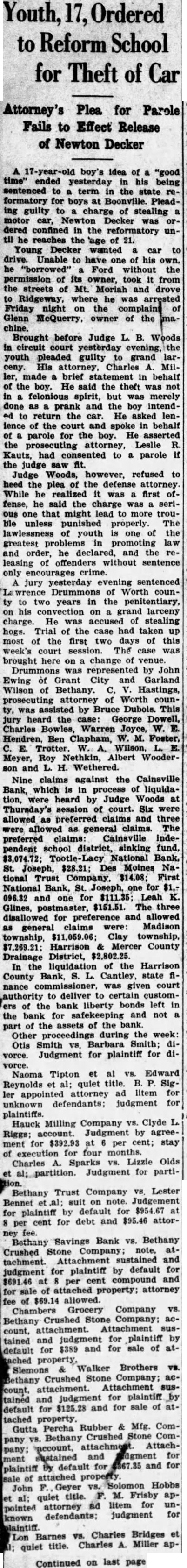 Reform to for Theft of Attorney's Plea for Parole Fails to Effect Release of Newton Decker boy's idea of "good ended yesterday his being sentenced term the state formatory for boys Boonville. guilty charge of stealing motor Newton Decker confined in the reformatory reaches the of Young Decker wanted car drive. Unable to have of his "borrowed" Ford without the permission of its owner, took from the streets of Mt. and drove Ridgeway, where he was arrested Friday night on the Glenn McQuerry, owner of the chine. Brought before Judge circuit court yesterday youth pleaded guilty to grand ceny. Charles Miller, made brief statement in behalf the boy. He said the theft not felonious spirit, but was merely prank and the boy intendreturn the He asked lenof the court and spoke in behalf parole for the boy. He asserted the attorney, Leslie had consented to parole the judge saw Judge Woods, however, refused heed the plea of the defense attorney. While he realized was first fense, he said the charge ous one that might lead to more trouble unless punished properly. The lawlessness youth of the greatest problems in promoting law and order, he declared, and the leasing without sentence encourages crime. jury yesterday evening sentenced Drummons of Worth countwo years in the his convection on grand larceny charge. He was accused stealing hogs. Trial of the case had taken most of the first two days of week's court session. The case brought here change of Drummons was represented by John Ewing of Grant City and Garland Wilson of Bethany. Hastings, prosecuting attorney of Worth counassisted Bruce Dubois. This jury heard the case: George Dowell, Charles Bowles, Warren Joyce, Ben Clapham, Meyer, Roy Nethkin, Albert Wooderand Wethered. Nine claims against the Cainsville Bank, which process liquidation, were heard by Judge Woods Thursday's session of court. Six were allowed as preferred claims and three allowed as general claims. The preferred claims: Cainsville pendent school district, sinking National Joseph, $28.21; Des Moines tional Trust $14.08; First National Bank, Joseph, for 096.32 and for $111.35; Leah Glines, $151.51. The three disallowed for preference and allowed claims were: Madison general Clay Harrison Mercer County Drainage District, $2,802.25. liquidation of the Harrison County Bank, Cantley, state nance given court to deliver certain customauthority the bank liberty bonds left the bank for safekeeping and not of the assets of the bank. Other proceedings during the week: Otis Smith Barbara vorce. Judgment for plaintiff vorce. Naoma Tipton al Edward Reynolds quiet title. Sigler attorney litem for appointed unknown defendants; judgment for plaintiffs. Hauck Milling Company Clyde Riggs: account. Judgment by agreement for $392.93 per cent; stay execution for four months. Sparks Lizzie Olds Charles Judgment for parti- Trust Company Lester Bethany suit note. Judgement Bennet on by default for $954.67 for plaintiff for debt and attorcent fee. Savings Bank Bethany Bethany Crushed Stone note, sustained and tachment. default for judgment for plaintiff by cent and $691.46 at per of attached attorney $69.14 allowed. Chambers Grocery Company Crushed Stone Company; Bethany attachment. Attachment count, and judgment for plaintiff by tained $389 and for sale of for Brothers Slemons Crushed Stone Attachment for plaintiff and judgment and for sale of for Rubber Mfg. ComGutta Percha Crushed Stone ComBethany sustained and default and attached Hobbs John Geyer title. Frisby quiet litem for pointed attorney judgment for known Charles Bridges Barnes Charles Miller quiet title. on last page Continued