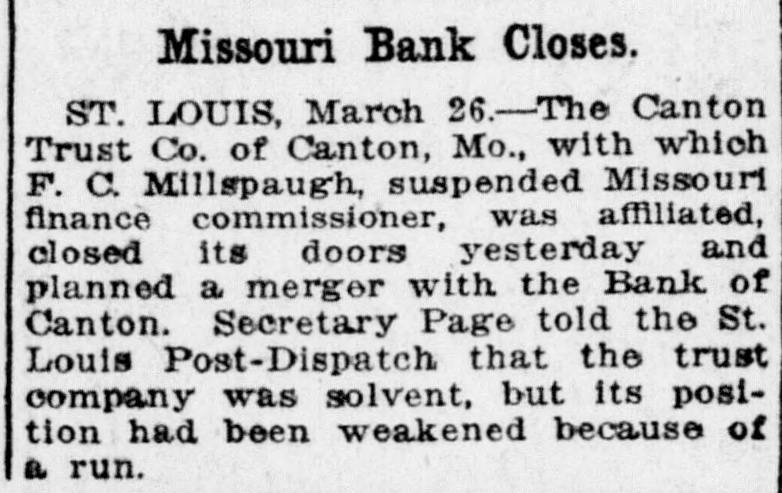 PROBE AT CANTON NOW (International News Service) Canton, Mo. March 26-Failure of the Canton Trust Company. of which F. C. Millspaugh, deposed finance commisioner, was once director. was caused by the errorneous report published in St. Louis morning newspaper that the bank had closed its doors, President F L. Lloyd of the trust company declared today. A run on the bank resulted, $10,000 was withdrawn by depositors. H. C. Martin and W. L. Vandeventer, bank ex aminer and assistant attorney general, respectively, reached here this morning and began an immediate investigation of the defunct concern They readily admitted that the investigation bears on the probe into the Millspaugh matter. hundred The 1923 sale amounted to 2,550,000 pounds and made an average of $19.57. The 1924 crop was reduced to $1,755,000 pounds and so far has brought $337,000 at an average price of $19.44. The final average will be between $20 and $21, L. B. Benner, president of the company said. The great difficulty in engaging in tobacco culture is the initial cost For field of twelve acres there must be erected a tobacco barn approximately 90 feet in length, 60 in width and 40 in height. At present lumber prices this is no small item. Once the barn is erected, however, the cost is reduced to that of planting and maturing the crop. Often the first crop will pay for the barn and leave a nice profit. Leavenworth County went in for tobacco culture a dozen or more years ago and several large barns were erected. There was a slump in price and labor conditions became difficult, so the culture was given up. Now there is a revival of interest in tobacco growing.