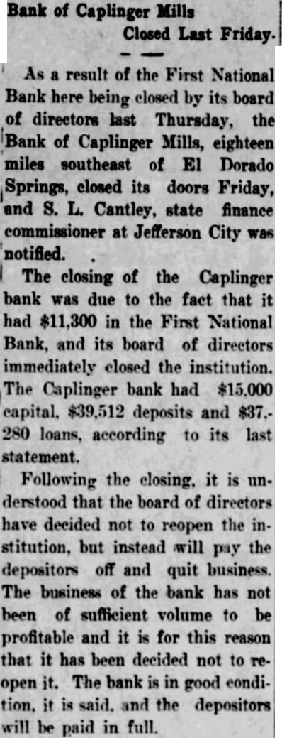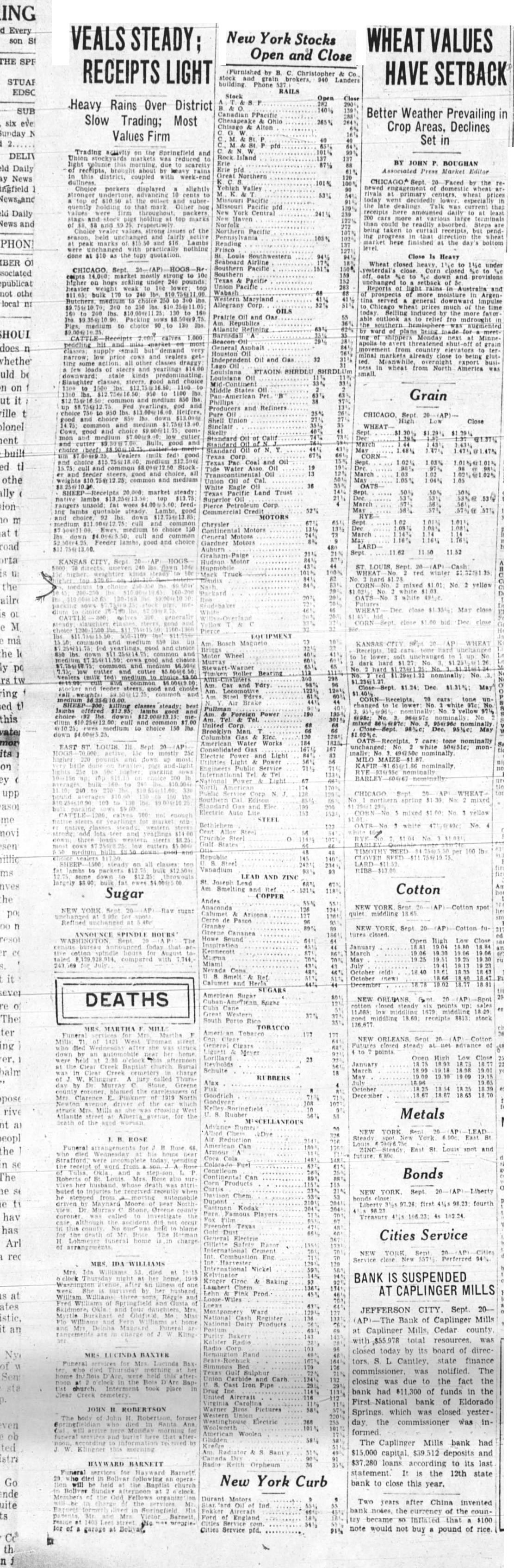 ING Every SPF VEALS STEADY; RECEIPTS LIGHT New York Stocks Open and Close WHEAT VALUES HAVE SETBACK .Heavy Rains Over District Slow Trading; Most Values Firm Trading coupled with porkers top values nothing done ANNOUNCE SPINDLE HOURS August WILLIAMS New York Curb Better Weather Prevailing in Crop Areas, Declines Set in JOHN BOUGHAN Press Faced by late dealings are taken that the bottom Close Cotton NEW YORK Bonds Liberty Motors Ford Cities Service by Christopher stock Landers Phone EDSC RAILS SUB Canadian Alton Island Northern 101% Valley Missouri the York 200 Pacific Southwestern under mostly provisions Texas on under Pacific Australia and moisture Western the time more and outlook as Refining Receipts Asphalt markets close being draggy of wheat from America was few be on 950 Grain it Phillips and 950 and Union Close common and and May good Texas Corp choice and 15. cull and all and good and 1.05% market steady lambs Pierce lambs Commercial 58% MOTORS common $7 choice Motors Auburn Motor kinds Truck mixed M and cutter Bearing Am. Car good Steel classes Jambs Works LEAD Joseph Am Sugar Andes YORK 126 89% YORK Open DEATHS stock Porto TOBACCO who points 23 was RUBBERS October U. Rubber Metals for ROSE Air of he sur her he by hav did Cities Service home Arl rec Perferred BANK IS SUSPENDED Baking AT CAPLINGER MILLS 45% at ates JEFFERSON CITY Sept. National Bank Mills of Caplinger an Cedar of Bakery closed its board of L finance was The Texas Carb to the due the fact Pipe bank $11,300 of funds in the First National bank of Eldorado Pictures Springs. which was closed yesterday the was inand The Caplinger Mills bank had J. Am $15,000 deposits and $37 280 loans according to last HAYWARD BARNETT Barnett statement It the 12th state bank to close this year. Two years after China invented bank the currency of the counBarnett that $100 of would not pound of