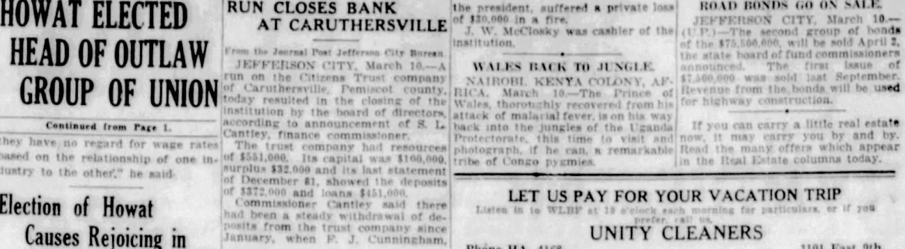 RUN CLOSES BANK AT CARUTHERSVILLE ROAD BONDS GO ON SALE the president suffered private loss CITY was second of bonds the Journal Jefferson City March WALES BACK TO JUNGLE of Trust KENYA bonds used of in of the of of his to of estate Continued Page you they for rates The offers he on of of Congo in to last deposits and loans LET US PAY FOR YOUR VACATION TRIP Election of Howat Cantley Listen WLBF steady of from the trust company since UNITY CLEANERS Causes Rejoicing in when Phone HA. 4168. 1101 East 9th.